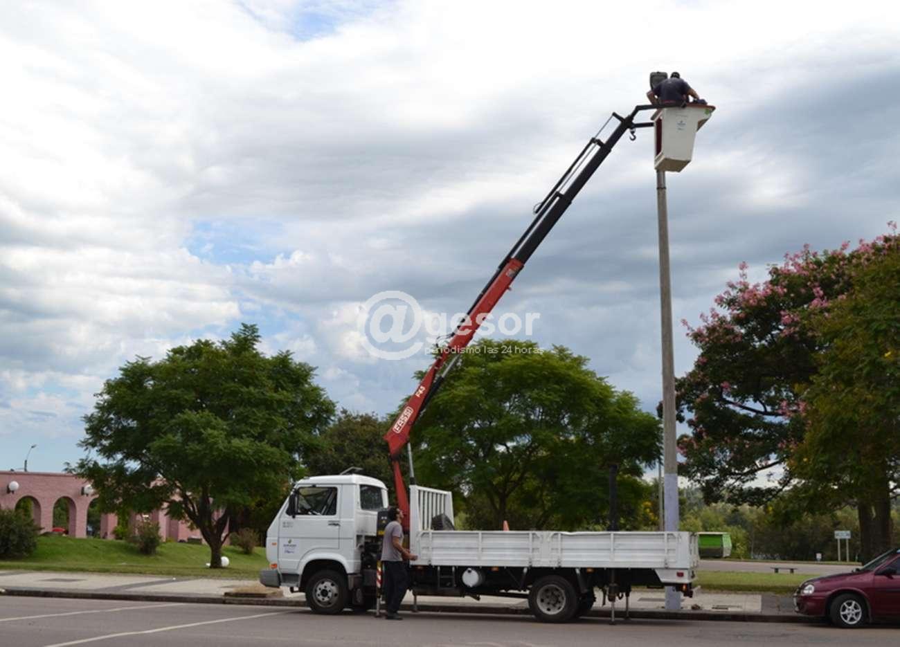 Personal municipal de las Secciones Iluminación y Parques y Jardines, ambas dependientes de la Dirección  de Arquitectura, trabajan para rehabilitar servicios de alumbrado público en varias zonas Mercedes.