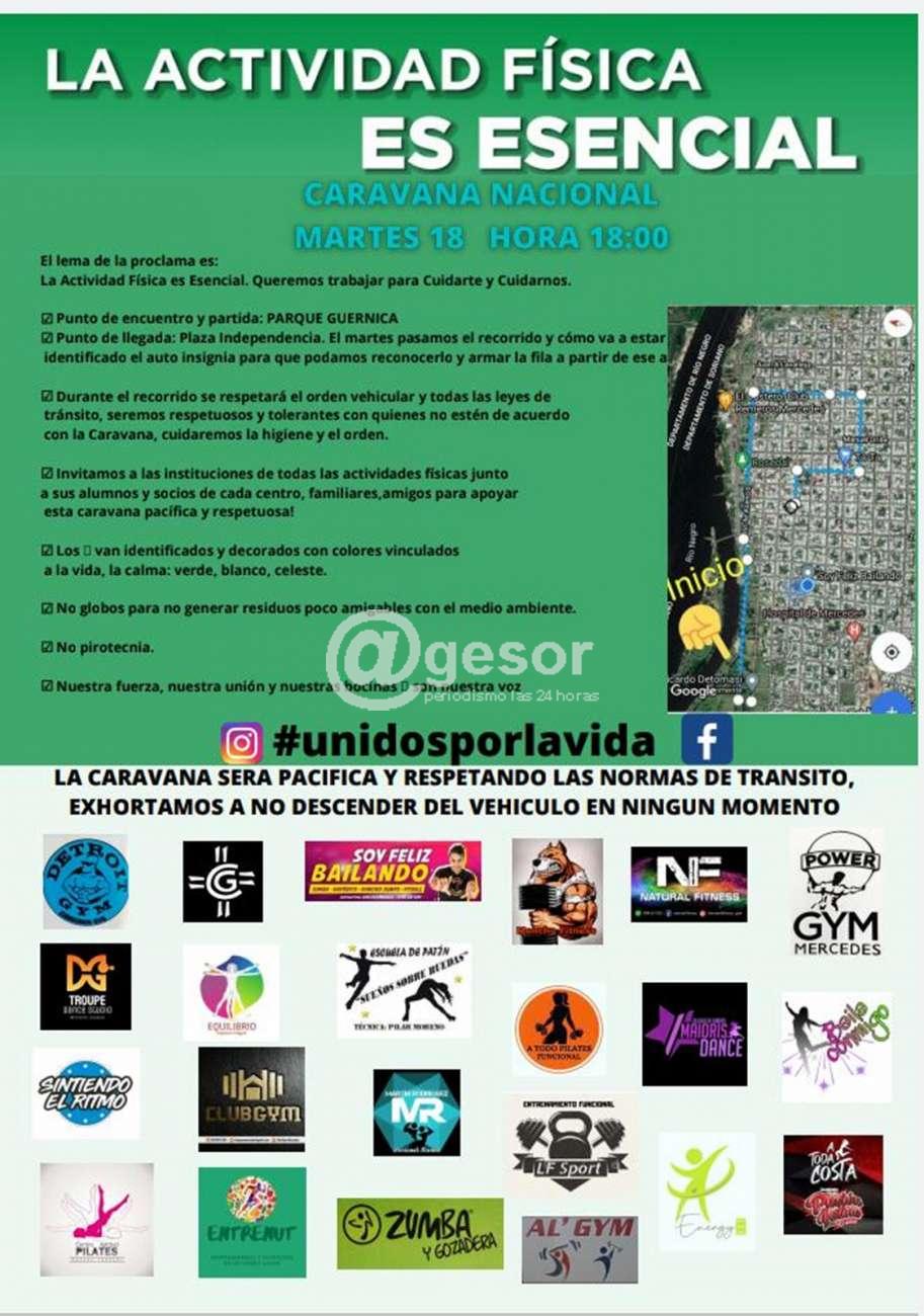 Bajo el lema “La actividad física es escencial. Queremos trabajar para cuidarte y cuidarnos”, los responsables de clubes y gimnasios de Mercedes se suman a la campaña nacional. Será con una caravana que se realizará el martes 18 de mayo, a las 18 horas, con punto de encuentro en Parque Gernica. Se trata de una caravana en vehículos, respetando todas las medidas sanitarias, y que llegará a Plaza Independencia.
