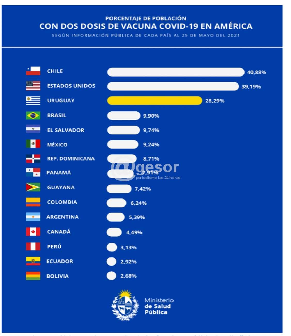 Al 25 de mayo del presente año, en Uruguay, las personas vacunadas con al menos una dosis corresponden al 45,8% de la población y el 28% recibió las dos dosis del esquema definido. Esta cifra es un gran logro para el país, resultado de una exitosa planificación y la adhesión de la población a la campaña, indica el documento.
