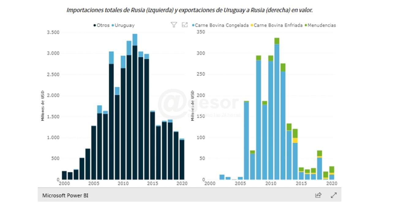 Actualmente la mayoría de las exportaciones de carne uruguaya van a China. En algunas ocasiones, cuando existe algún enlentecimiento o problema puntual en dicho mercado, el producto se desvía hacia mercados alternativos. Rusia ha operado como alternativa en el pasado reciente. Cuando esto sucede, se experimenta un descenso en el precio. A partir de 2022, este descenso sería más pronunciado porque los aranceles rusos serían más elevados.