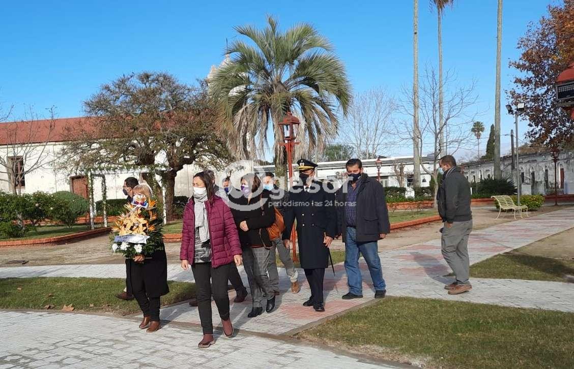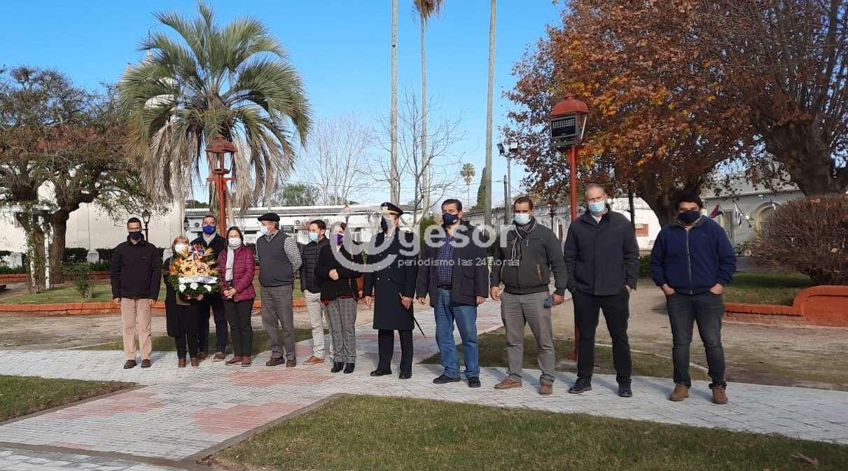 Debido a las medidas sanitarias vigentes, la ceremonia fue de ribetes muy sencillos y se circunscribió al depósito de una ofrenda floral junto al monumento que perpetua su memoria en la plaza de la histórica localidad.