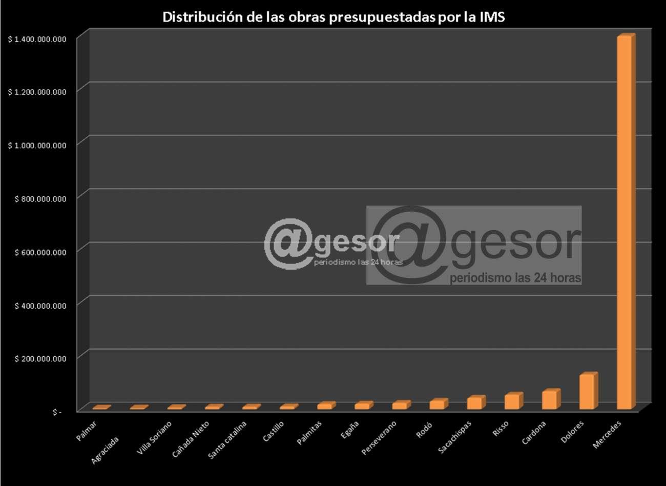 En la distribución geográfica del presupuesto se destacan localidades como Risso con obras por $53.740.000 , muy por encima de lo que recibirá el municipio de Palmitas ($ 18.500.000), incluso superando a José Enrique Rodó ($ 30.780.000).