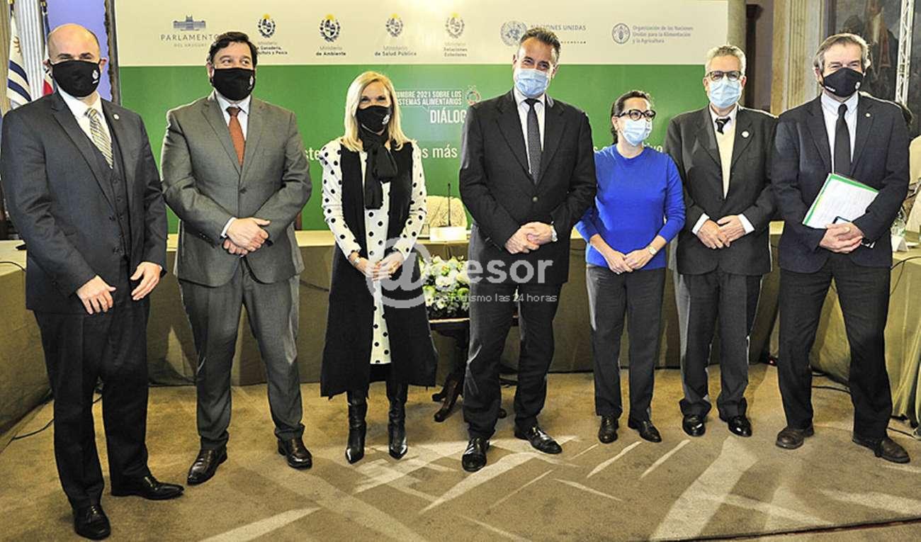 Argimón; los ministros de Ganadería, Agricultura y Pesca, Carlos Uriarte; Salud Pública, Daniel Salinas, y Medio Ambiente, Adrián Peña; el director general de Secretaría de la Cancillería, Diego Escuder; el director ejecutivo de la Agencia Uruguaya de Cooperación Internacional (AUCI), Mariano Berro; el presidente del Congreso de Intendentes, Yamandú Orsi, y la coordinadora residente de Naciones Unidas, Mireia Villar, participaron en la sesión de clausura del “Diálogo nacional Uruguay: Hacia sistemas alimentarios más saludables, sostenibles e inclusivos” que se realizó en la tarde de este jueves 24 , en el Salón de Eventos del Palacio Legislativo.
