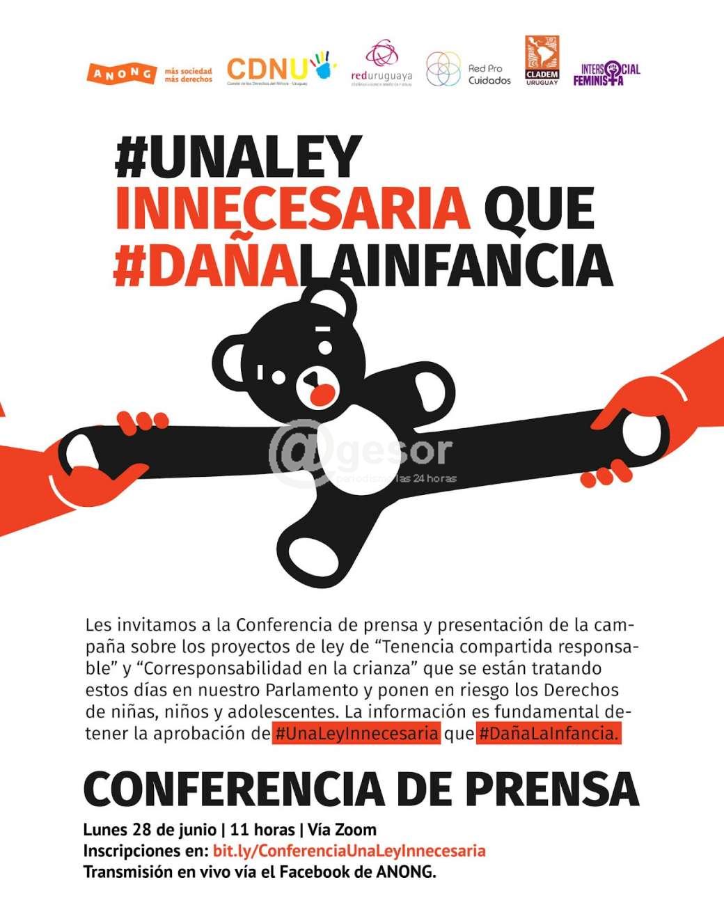 El lunes 28 de junio a las 11 horas, organizaciones y redes de defensa de derechos de  niñas, niños y adolescentes presentan a toda la población la Campaña #UnaLeyInnecesaria que #DañalaInfancia con el objetivo de informar sobre los proyectos de ley “Tenencia Compartida Responsable” y “Corresponsabilidad en la Crianza”, actualmente en análisis en el Parlamento.