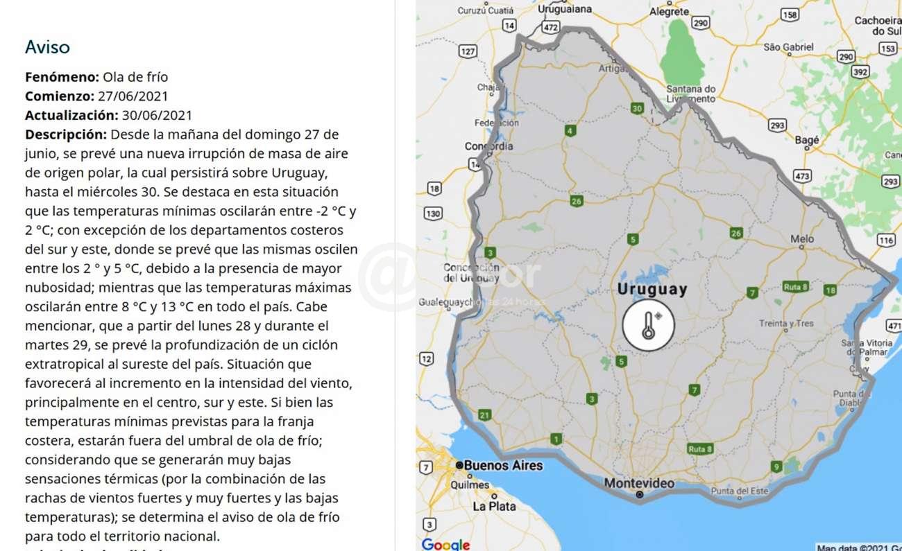 Si bien las temperaturas mínimas previstas para la franja costera, estarán fuera del umbral de ola de frío; considerando que se generarán muy bajas sensaciones térmicas (por la combinación de las rachas de vientos fuertes y muy fuertes y las bajas temperaturas); se determina el aviso de ola de frío para todo el territorio nacional.