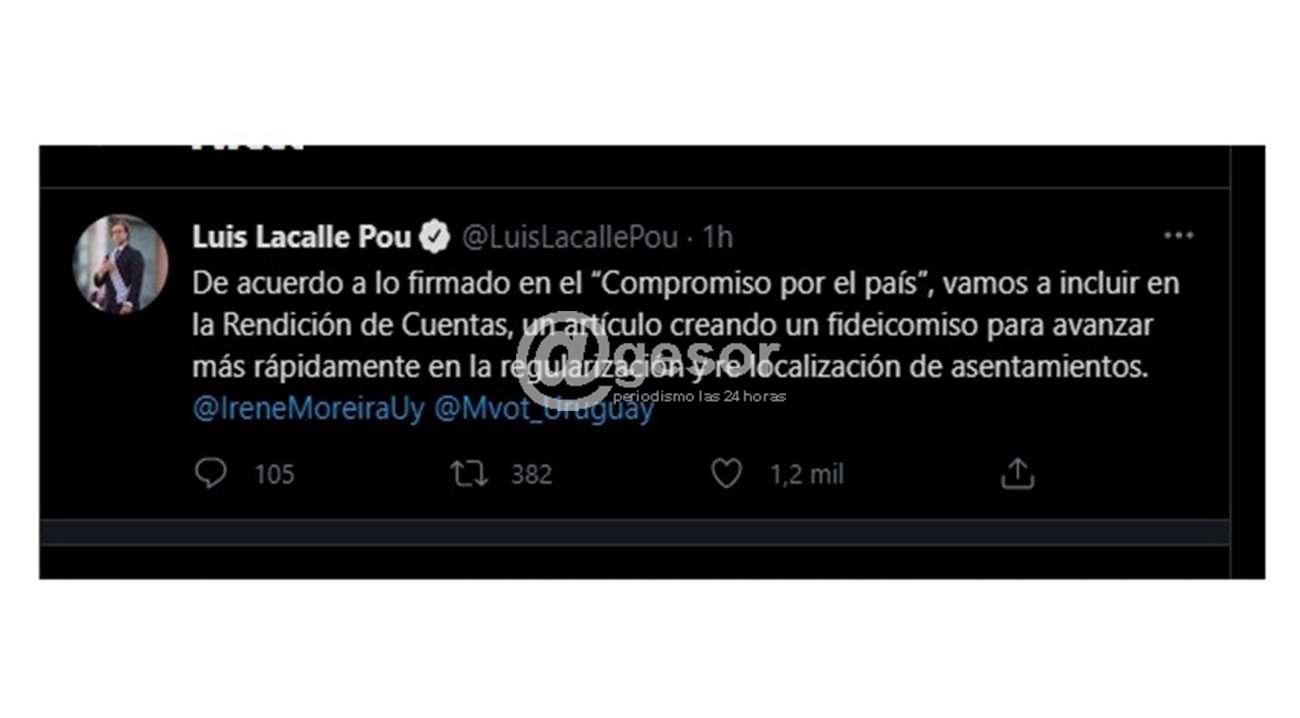 Este sábado el presidente Luis lacalle Pou, anunció en su cuenta de Twitter que se incluirá en la Rendición de Cuentas un artículo de creación de un fideicomiso para avanzar en la regularización y relocalización de asentamientos.