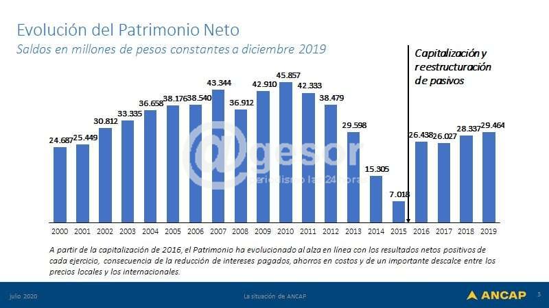 En las gráficas ilustradas por el Presidente de ANCAP, quedo reflejado que entre los años 2014 al 2019 los Uruguayos pagamos un sobrecosto de 850 millones de Dólares en los combustibles, para compensar la caída patrimonial de ANCAP, que pasó de 45,000 a 7,000 mil millones de pesos, durante los años 2010 al 2015, por las malas inversiones en los diferentes modelos de negocios de ANCAP.