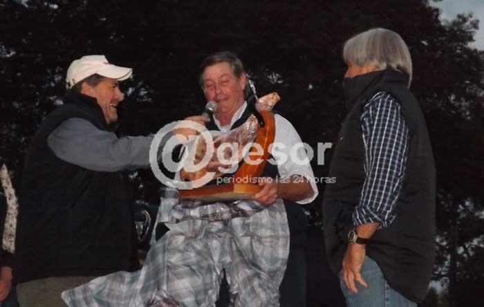 En medio de un ambiente de bromas, el jefe comunal fue invitado a subir al estrado, donde Etchegoyen dirigió unas palabras al gobernante anfitrión y le hizo entrega de un enorme paquete, que no dejó de llamar la atención a los espectadores que estaban más cerca de la tarima de premiación.