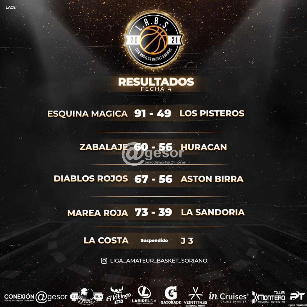 Se disputó la cuarta fecha del torneo de la Liga Amateur de Basket este domingo en el gimnasio "Mario E. Bellini" del Club Remeros Mercedes, con los siguientes resultados: Esquina Mágica 91 - Los Pisteros 49; Zabalaje 60 - Huracán 56; Diablos Rojos 67 - Aston Birra de Dolores 56; Marea Roja 73 - La Sandoria 39. El juego entre La Costa y J3 de Fray Bentos fue suspendido por anuncios meteorológicos.