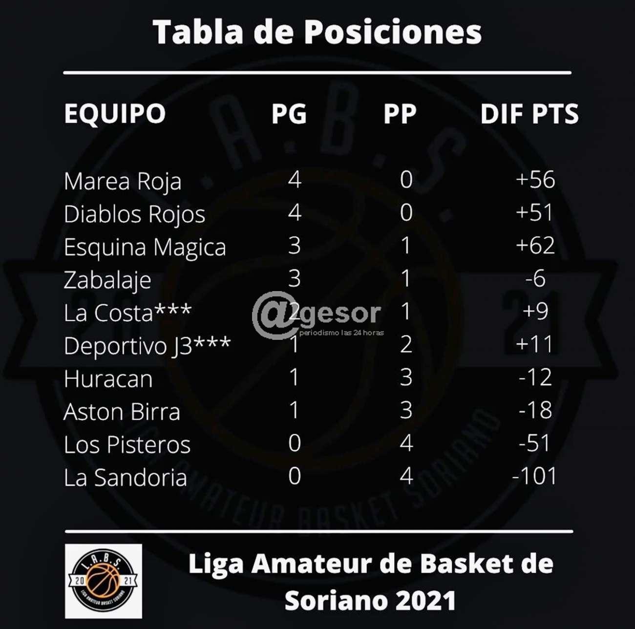 La tabla de posiciones hoy tiene a Marea Roja y Diablos Rojos con 4 partidos ganados; Esquina Mágica y Zabalaje 3; La Costa 2; Deportivo J3, Huracán y Astón Birra 1; Los Pisteros y La Sandoria 0.