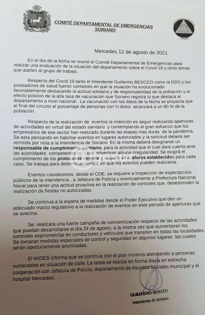 El Comité Departamental de Emergencias espera medidas claras de parte del Poder Ejecutivo que den un marco regulatorio adecuado para la realización de  eventos.