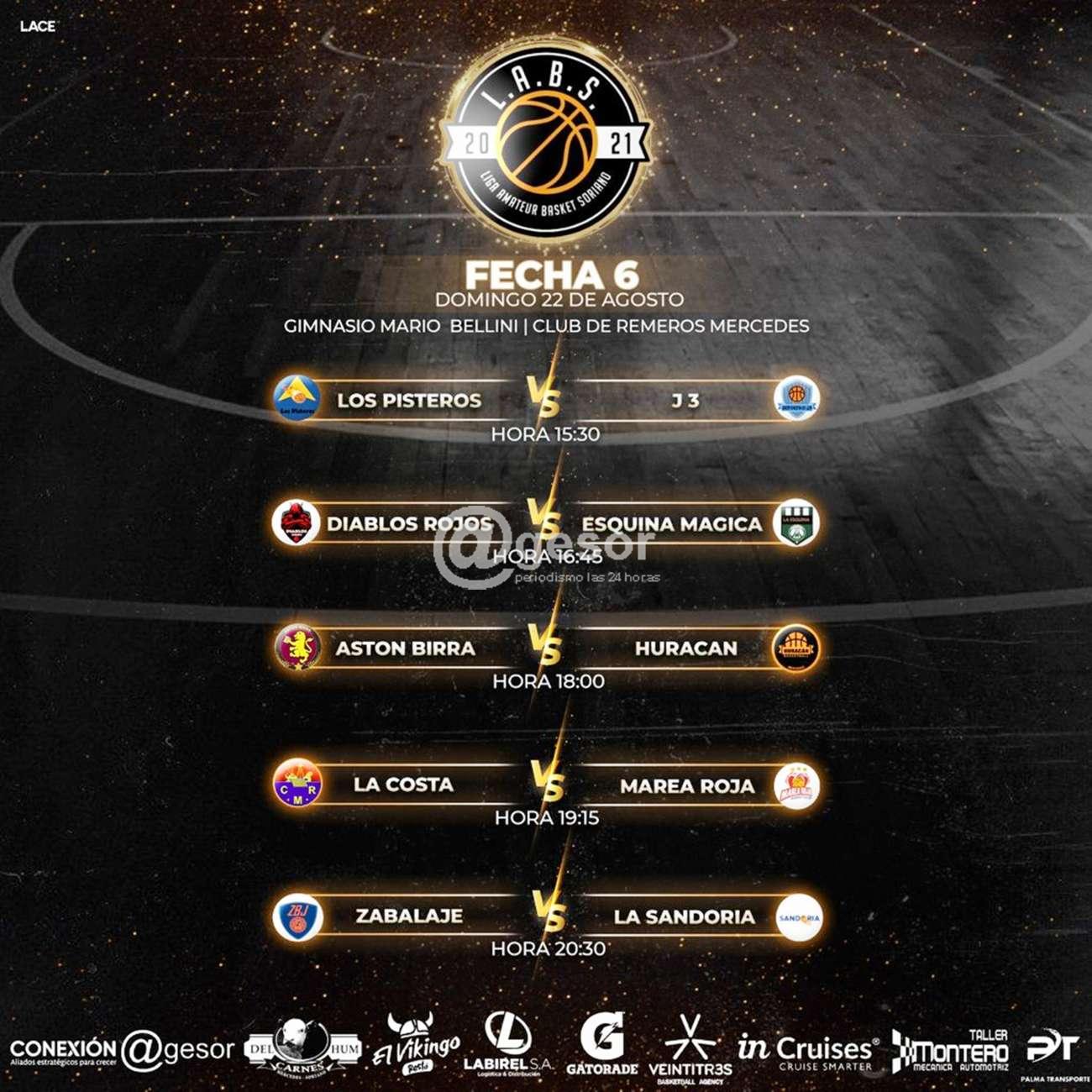 En el gimnasio "Mario E. Bellini" del Club Remeros Mercedes, este domingo 22 de agosto a partir de las 15.30 horas se iniciará la sexta fecha, que al igual que las demás constará de cinco encuentros, de acuerdo al siguiente detalle: