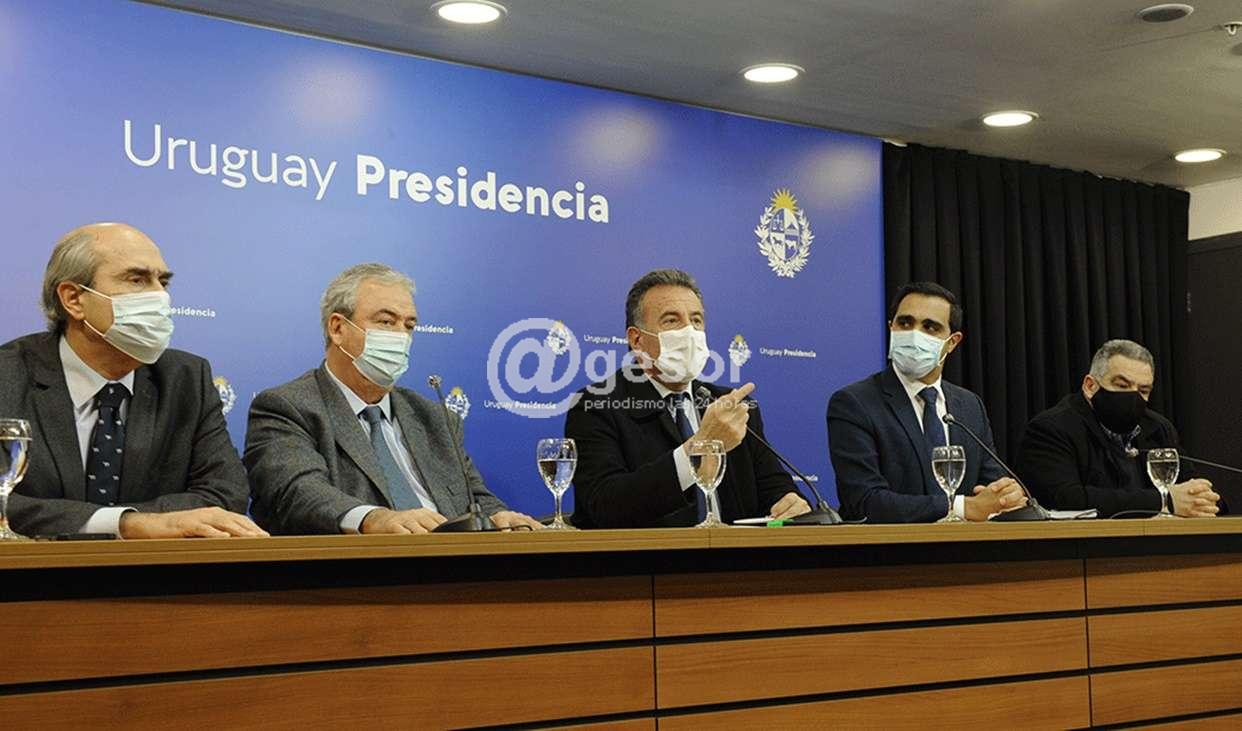 La conferencia de prensa fue encabezada por el ministro del Interior, Luis Alberto Heber; el ministro de Salud Pública, Daniel Salinas, y el subsecretario Luis Satdjian; el presidente del Instituto del Niño y Adolescente del Uruguay (INAU), Pablo Abdala, y el titular del Congreso de Intendentes, Carmelo Vidalín.