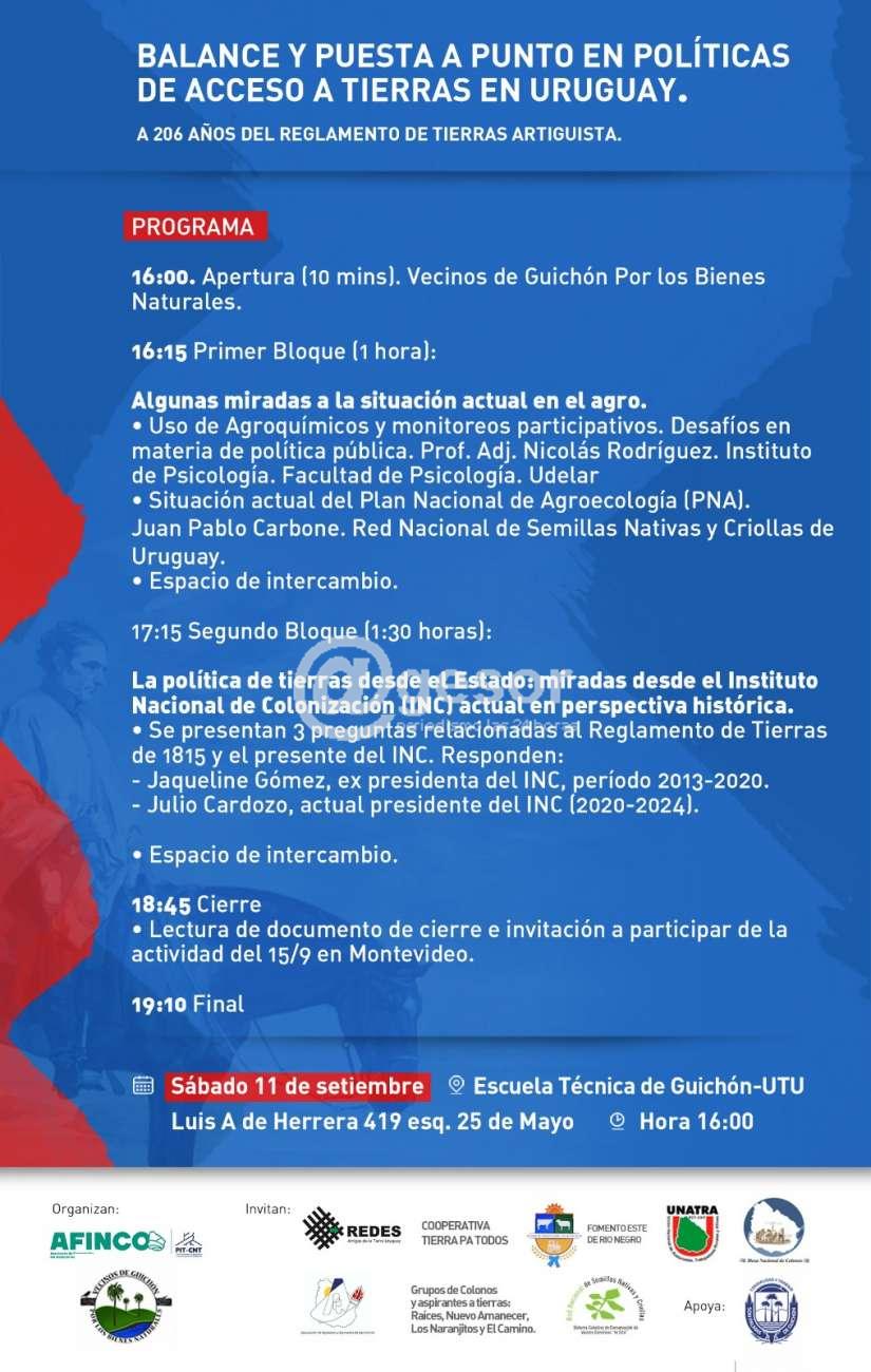La Asociación de Funcionarios del Instituto Nacional de Colonización,  y Colectivo Guichón por los Bienes Naturales realizan una charla, este sábado 11 de setiembre, a  206 años del Reglamento de Tierras  impulsada por  José  Gervasio Artigas. La actividad comenzará a las 16 horas, interviniendo varios panelistas.