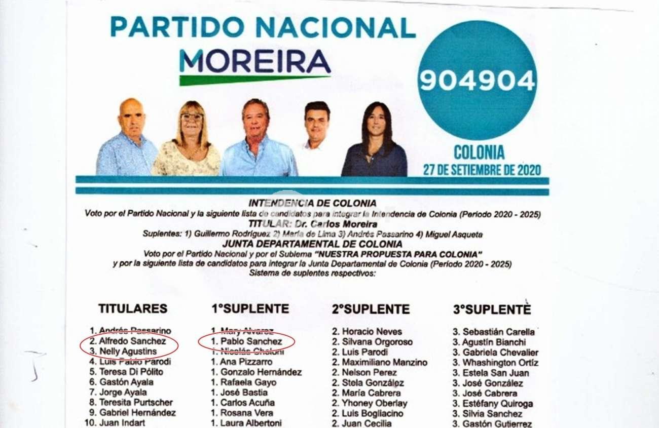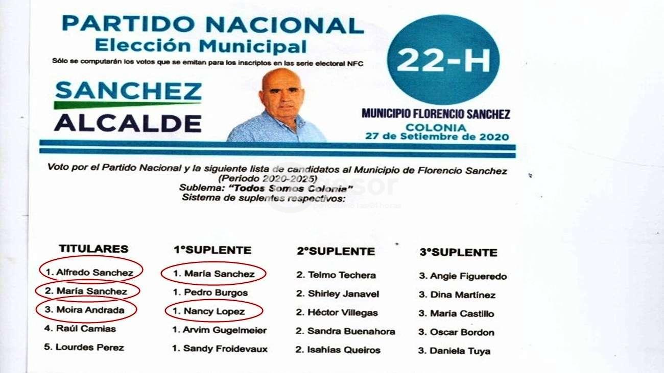 En cuanto al Municipio la hoja que identificó a Alfredo Sánchez como candidato a Alcalde fue la 22-H de Florencio Sánchez y llevaba como primer titular a él, como segundo titular a su hija a María Sánchez y como tercer titular a Moira Andrada. Al resultar electo como Alcalde Alfredo Sánchez, llevó como secretaria personal a Moira Andrada que estaba en tercer lugar como Concejal electa y por lo tanto en lugar de ésta ingresó su primer suplente, Nancy López, la nuera de Sánchez, pareja del hijo Pablo Sánchez que es Edil.