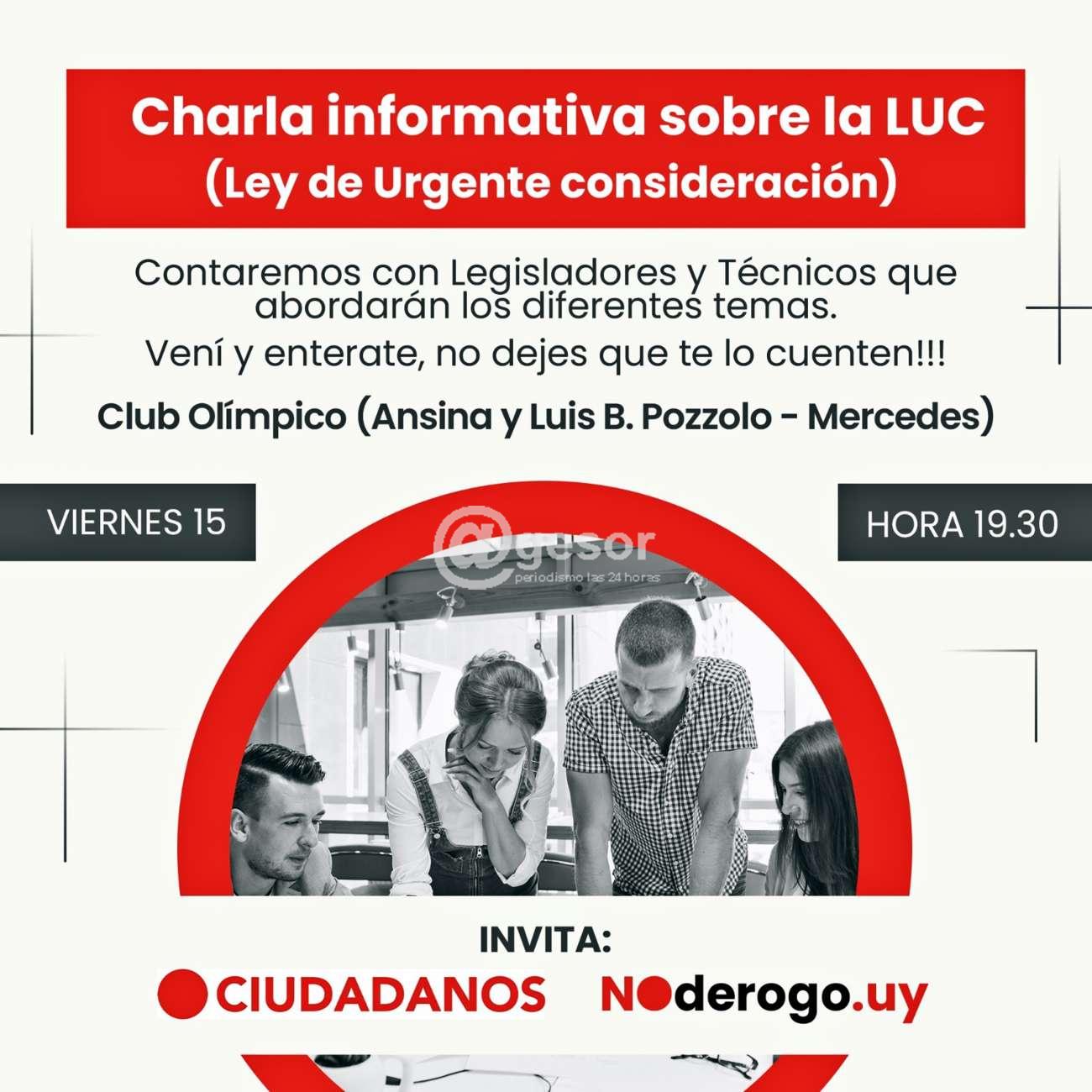 El Sector Ciudadanos del Partido Colorado, está organizando charla informativa sobre la LUC (Ley de Urgente Consideración), a desarrollarse en salón del Club Olímpico en el barrio Cerro de Mercedes, ubicado en Ansina y Luis B. Pozzolo, este viernes 15 desde las 19.30 horas.