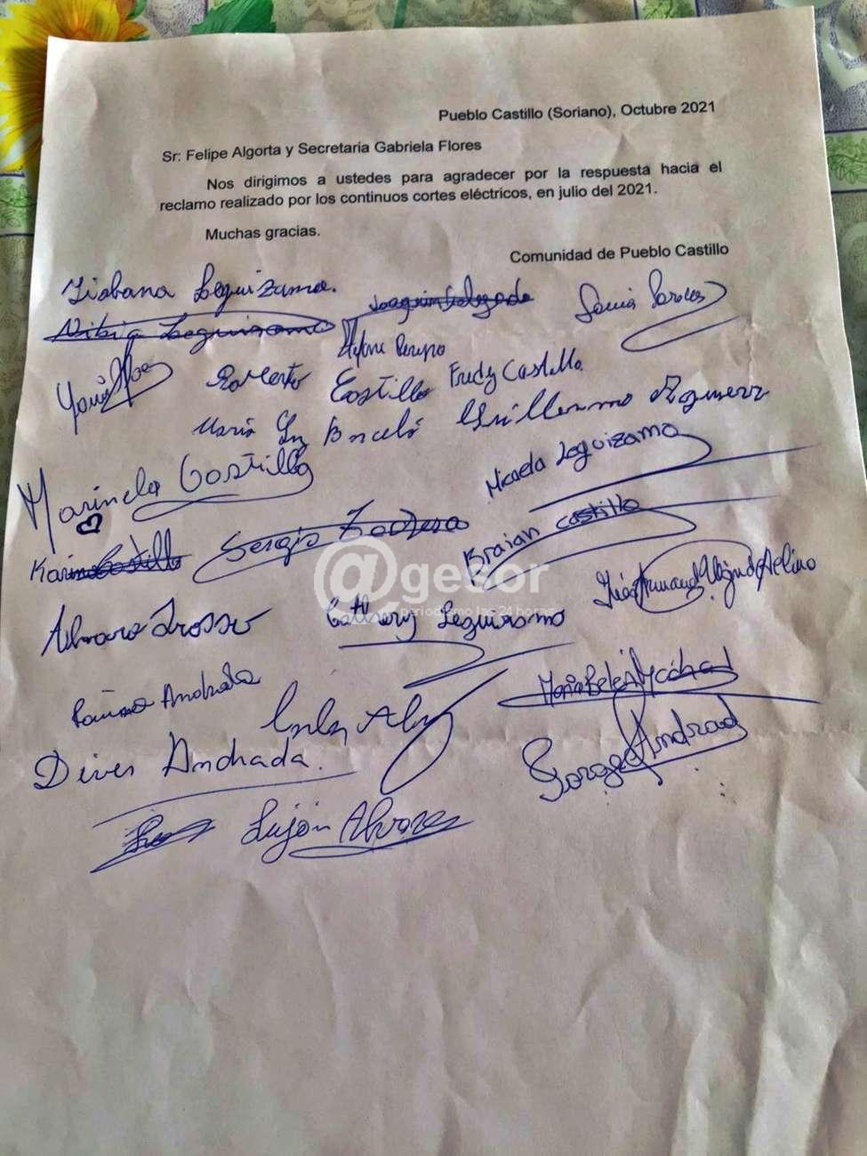 De acuerdo a gestiones realizadas por el Edil José Lavista, frente a autoridades de UTE, concretamente el Director Felipe Algorta y su secretaria Gabriela Flores, en referencia a cortes de energía eléctrica en pueblo Castillo, vecinos de esa localidad nos hacen llegar una carta de agradecimiento a esas autoridades de UTE, pues los continuos cortes de energía eléctrica han cesado.
