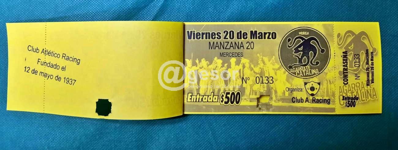 Para el show de los 20 años de Murga La Catalina que lo organiza el Club Racing de Mercedes junto a El Foco Producciones y el apoyo de la Intendencia Municipal de Soriano, las entradas del año pasado, donde la murga se iba a presentar en la Manzana 20 y debió postergarse, tienen validez, lo que sí deben hacer quienes tienen en su poder las mismas, pasar por la sede del Club Racing de lunes a viernes de 20.30 a 22.00 horas para que se las sellen y así tengan validez para el show del 11 de diciembre en el estadio "Luis Köster".