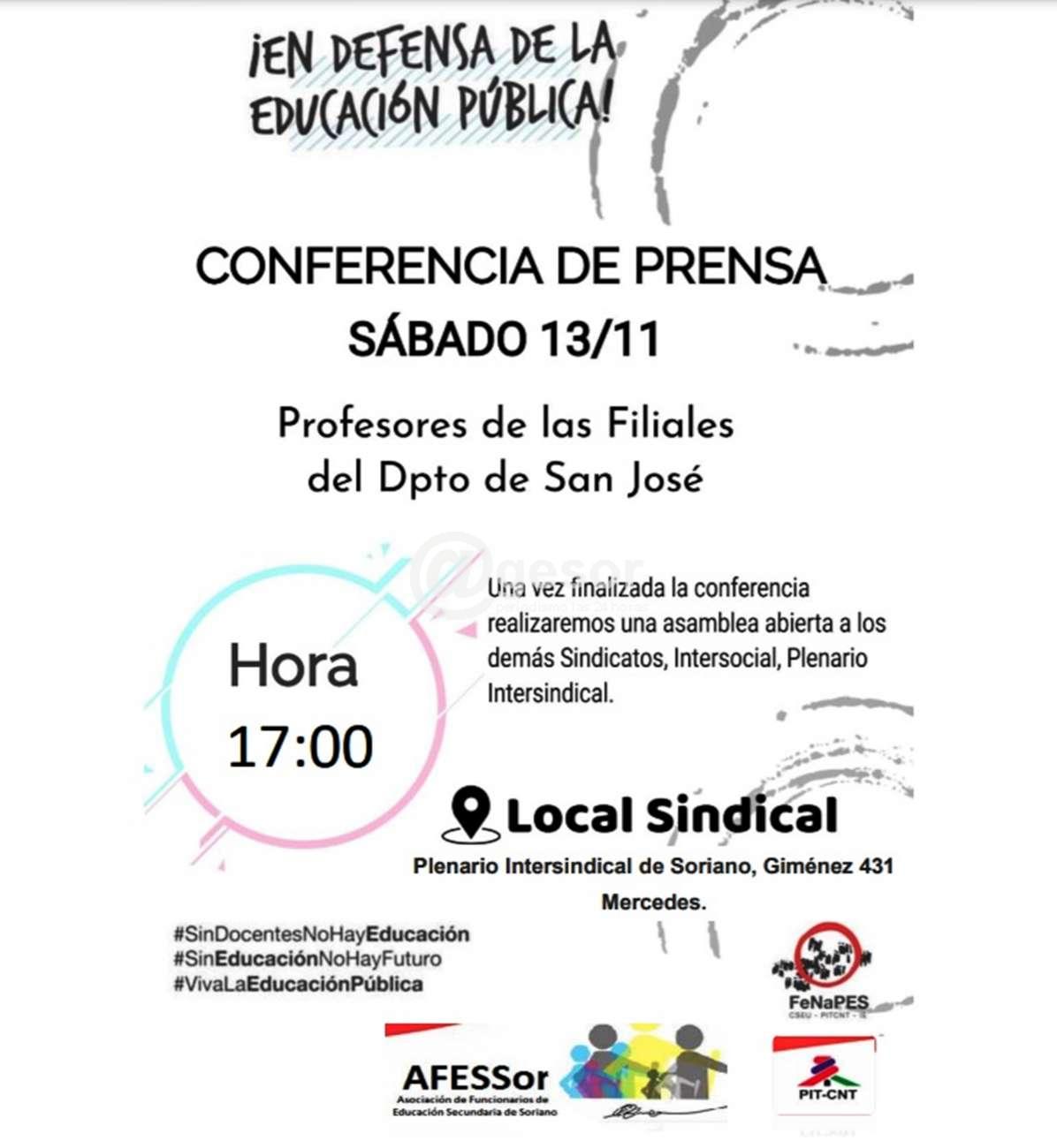Este sábado a las 17.00 horas en sede del Plenario intersindical, Giménez 431, Mercedes, con presencia de Profesores de las filiales del departamento de San José sse realizará conferencia de prensa ¡EN DEFENSA DE LA EDUCACIÓN PÚBLICA!