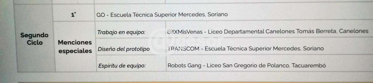 Los alumnos LARA OTAZÚ y FRANCO MARTÍNEZ, del 3er año del Bachillerato de Robótica obtuvieron el PRIMER PREMIO en las OLIMPÍADAS de CEIBAL, en la categoría ROBÓTICA SEGUNDO CICLO, con el apoyo y acompañamiento de las docentes de informática LILIANA BUZÚN y MERCEDES KAHRS.
