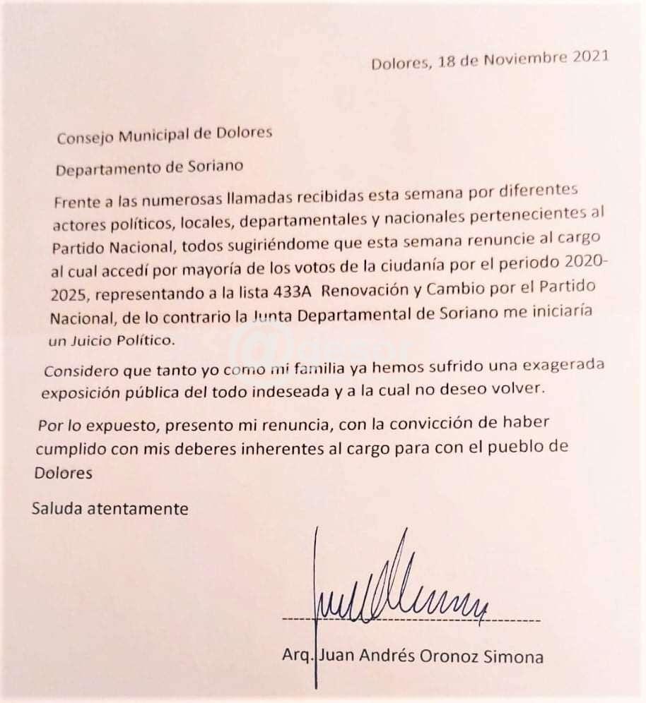 En la jornada de este jueves Oronóz presentó su carta de renuncia al cargo de Alcalde “frente a las numerosas llamadas recibidas esta semana por diferentes actores políticos, locales, departamentales y nacionales pertenecientes al Partido Nacional, todos sugiriéndome que esta semana renuncie al cargo”, según expresó.
