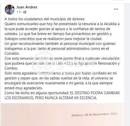 Frente a las numerosas llamadas recibidas esta semana por diferentes actores políticos, locales, departamentales y nacionales pertenecientes al Partido Nacional, todos sugiriéndome que esta semana renuncie al cargo al cual accedí por mayoría de votos de la ciudadanía por el período 2020-2025, representando a la lista 433A Renovación y Cambio del Partido Nacional, de lo contrario la Junta Departamental de Soriano me iniciaría un Juicio Político.