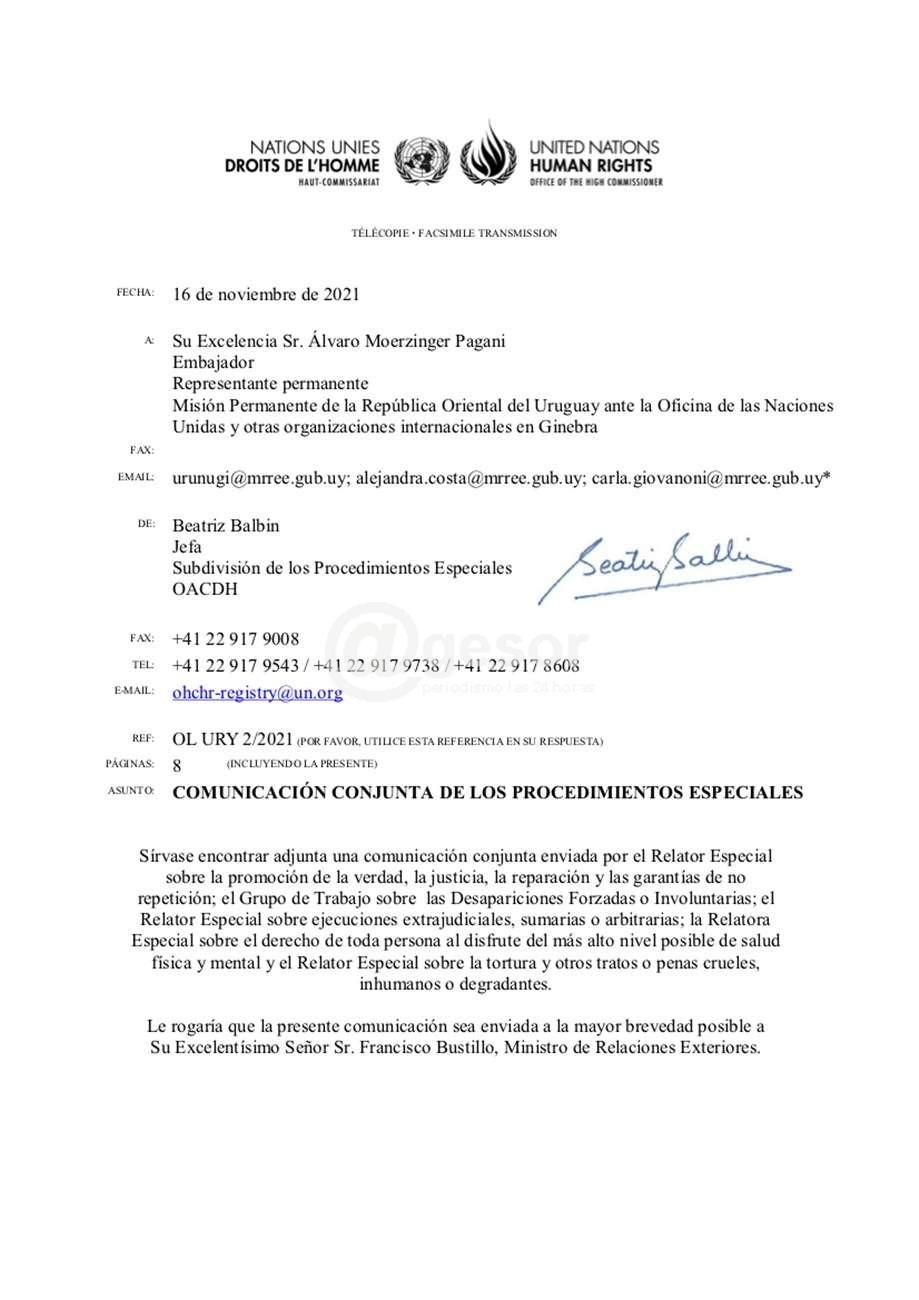 La misiva está firmada por el Relator Especial sobre la promoción de la verdad, la justicia, la reparación y las garantías de no repetición; el Presidente-Relator del Grupo de Trabajo sobre las Desapariciones Forzadas o Involuntarias; el Relator Especial sobre ejecuciones extrajudiciales, sumarias o arbitrarias; la Relatora Especial sobre el derecho de toda persona al disfrute del más alto nivel posible de salud física y mental y el Relator Especial sobre la tortura y otros tratos o penas crueles, inhumanos o degradantes.