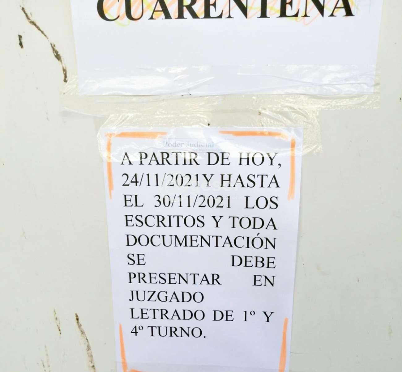 Este miércoles las sedes de los Juzgados de 2º y 3er. Turno de Mercedes, aparecieron con un cartel que expresa "cerrado por cuarentena".