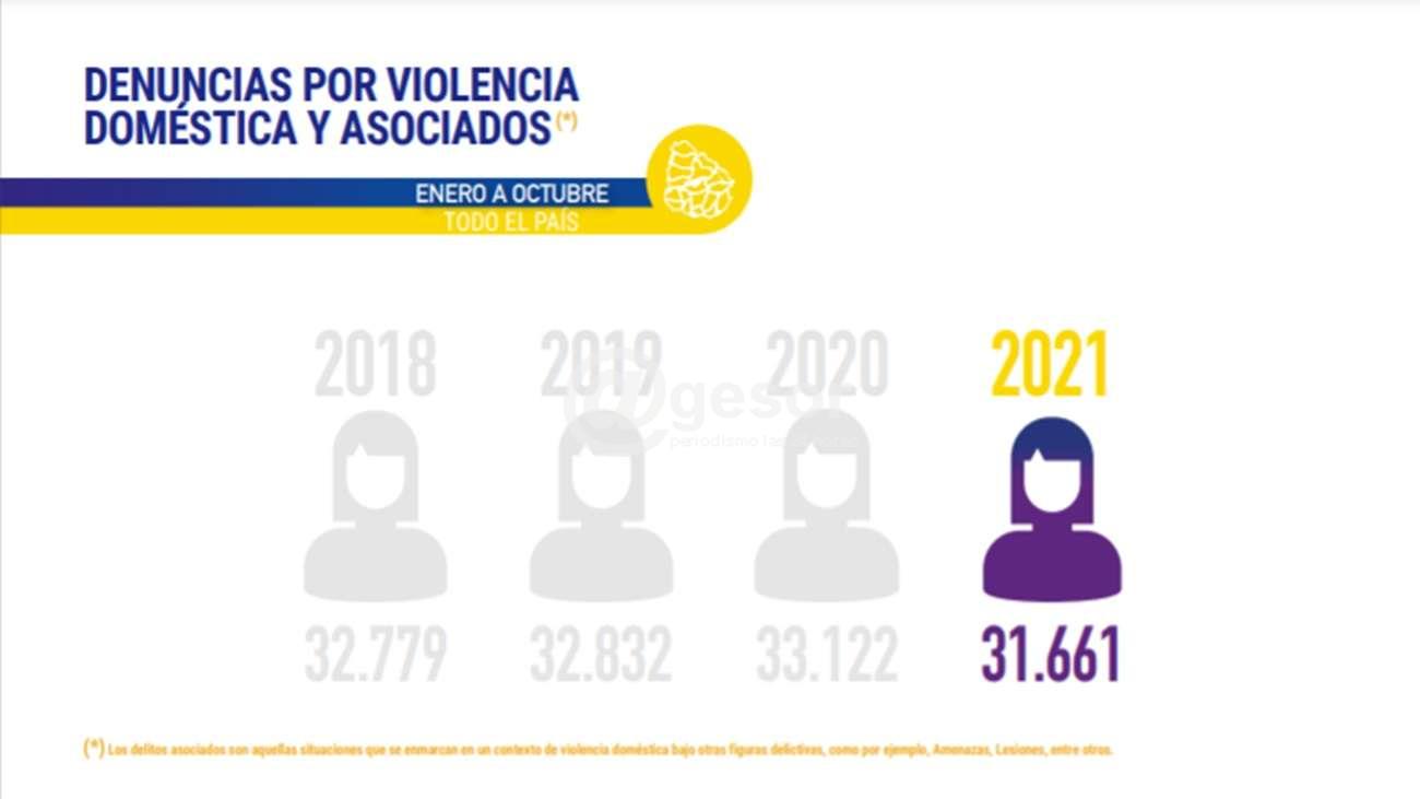 En los primeros 10 meses de 2021 se registraron 31.661 denuncias por violencia doméstica y asociados en nuestro país, lo que representa 104 denuncias diarias, una denuncia cada 14 minutos.