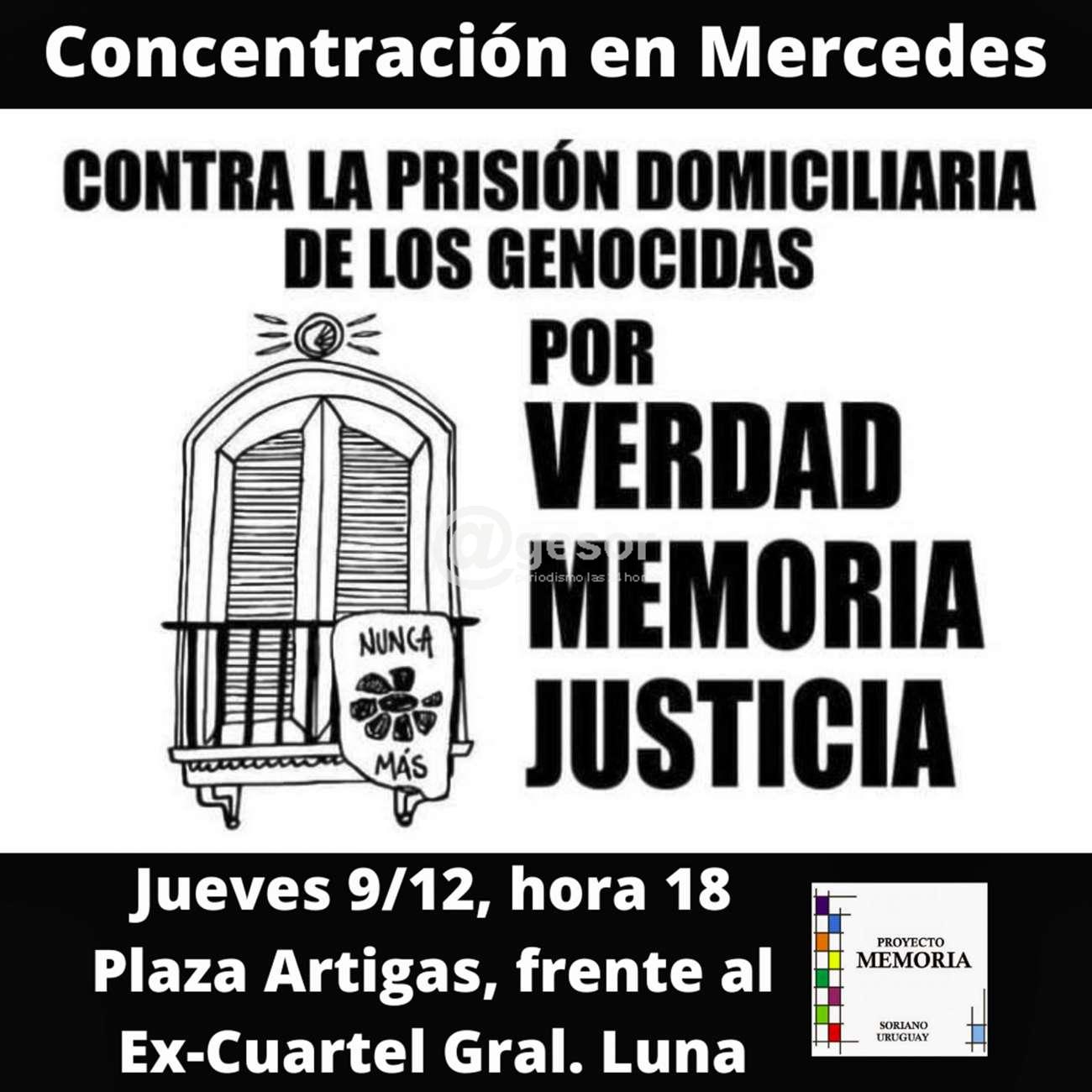 Este jueves 9 a las 18.00 horas en plaza Artigas, frente al exCuartel Gral Luna, la Comisión Memoria, Justicia y contra la Impunidad Soriano está convocando a concentración para manifestarse contra proyecto de ley que está analizándose de prisión domiciliaria para personas mayores de 65 años y que desde las organizaciones defienden los Derechos Humanos sostienen que su lucha es "contra la prisión domiciliaria de los genocidas, que se verían incluidos en dicho proyecto.