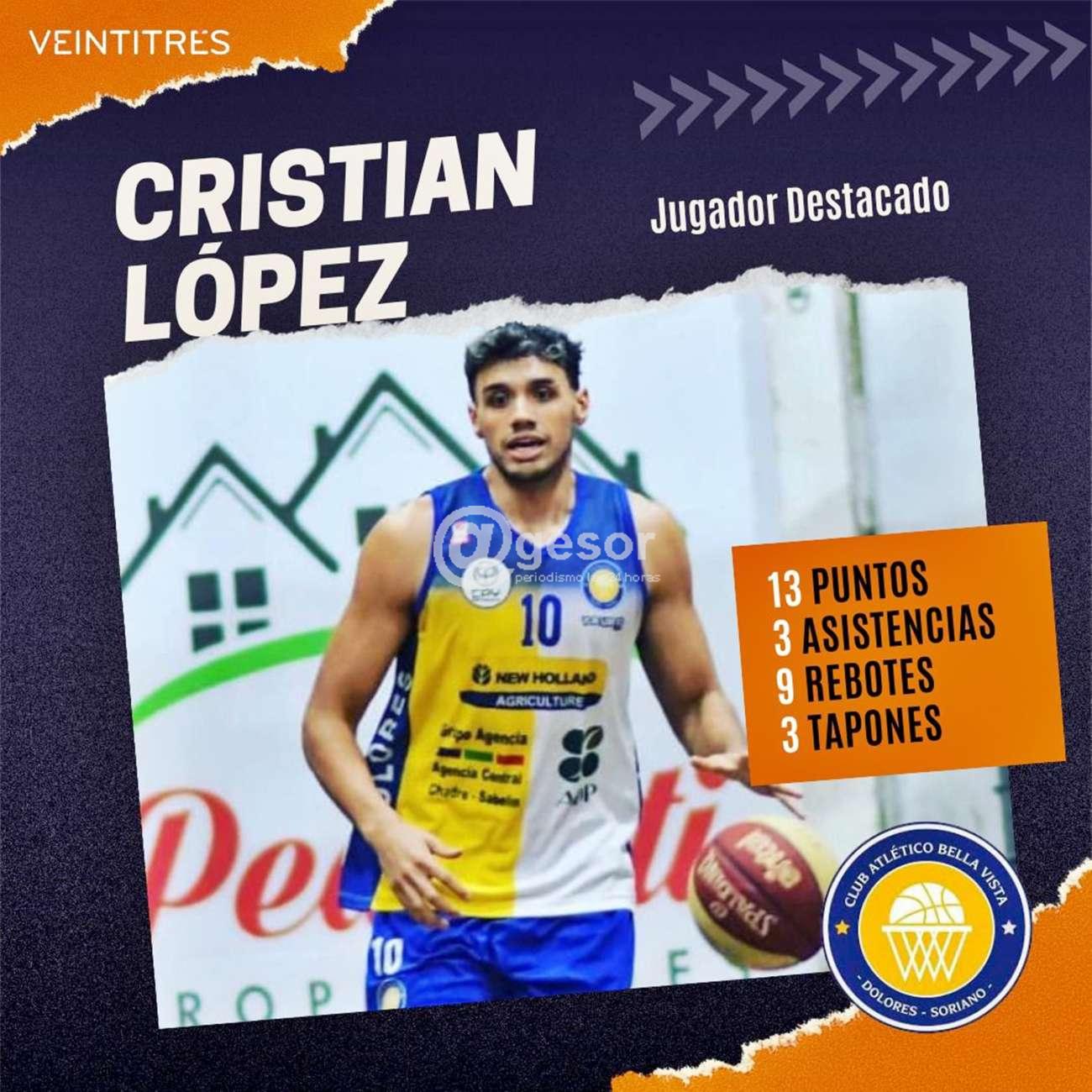 En el juego de local de Bella Vista doloreño ante el invicto Remeros, por la quinta fecha del 83º Campeonato Competencia de la Liga Regional de Básquetbol de Soriano, volvió a destacarse el sanducero al servicio de los papales, CRISTIAN LOPEZ, el representado por VEINTITRÉS marcó 13 puntos, dio 3 asistencias, recogió 9 rebotes y puso 3 tapones al servicio de su equipo.