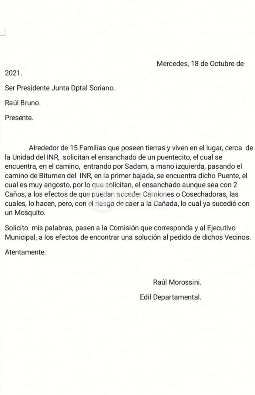 El Edil Raúl Morossini informó que el 18 de octubre en la Junta Departamental de Soriano, "elevamos un pedido de 15 familias, hecho llegar por el vecino Javier Rivero, respecto a un puente cercano a la Unidad 24 del INR en paraje Pense, en el día de ayer, finalizó la reforma del mismo, el cual ahora permite el paso de cualquier vehículo, sin ningún tipo de problema, agradecer la celeridad y sensibilidad del Departamento de Obras y su personal de la Intendencia de Soriano, lo cual redunda en beneficio de la gente laburadora, quienes a la hora de pasar alguna máquina por el lugar, se les complicaba, por ello agradecemos".