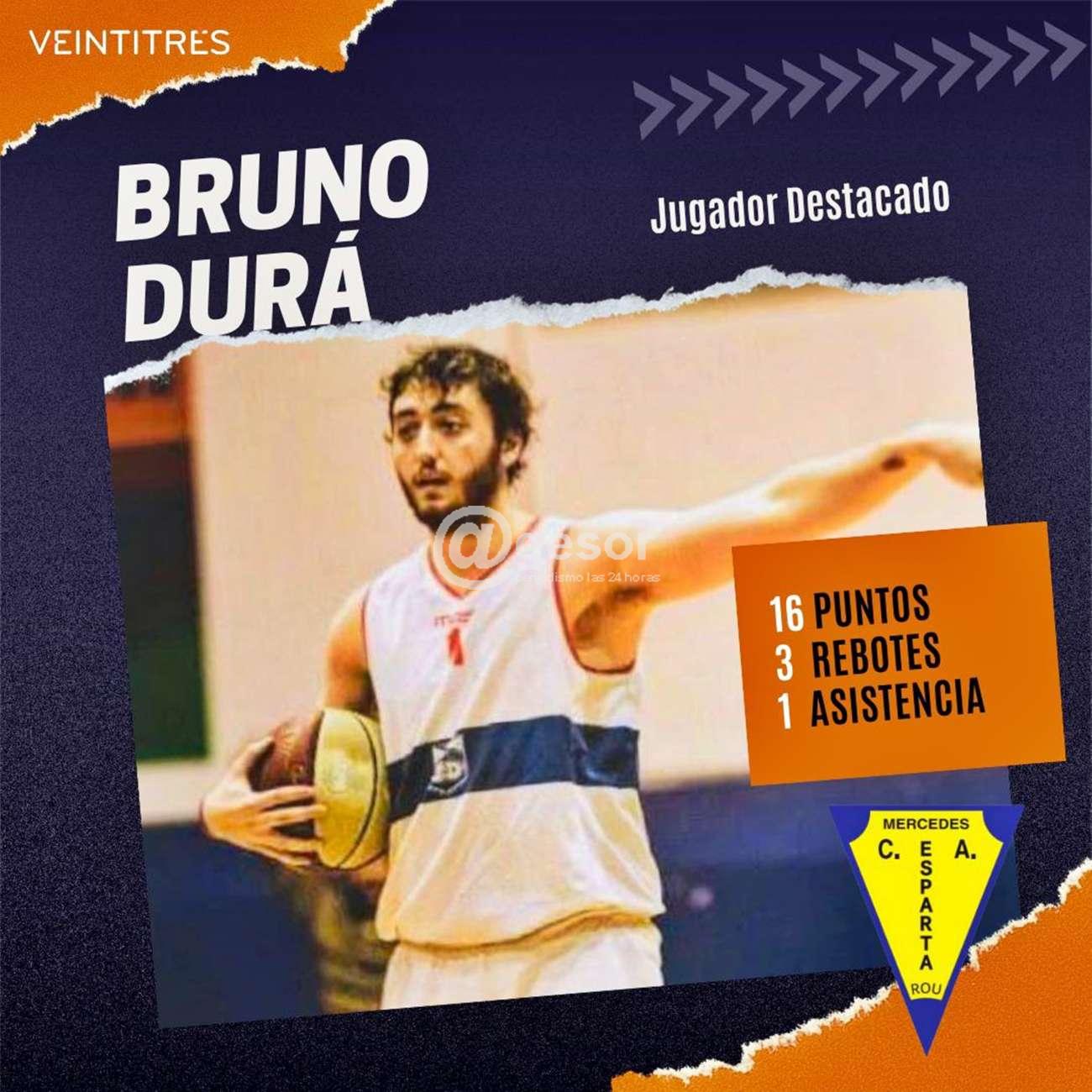 En el encuentro por el 83º Campeonato Competencia de la Liga Regional de Básquetbol de Soriano, que disputaron Sandú y Esparta, con victoria sanducera en las cifras de 91 a 53, VEINTITRÉS destaca en el amarillo de calle Leandro Gómez (exPaysandú) a su representado, BRUNO DURÁ que consiguió 16 puntos, 3 rebotes y 1 asistencia demostrando sus cualidades.