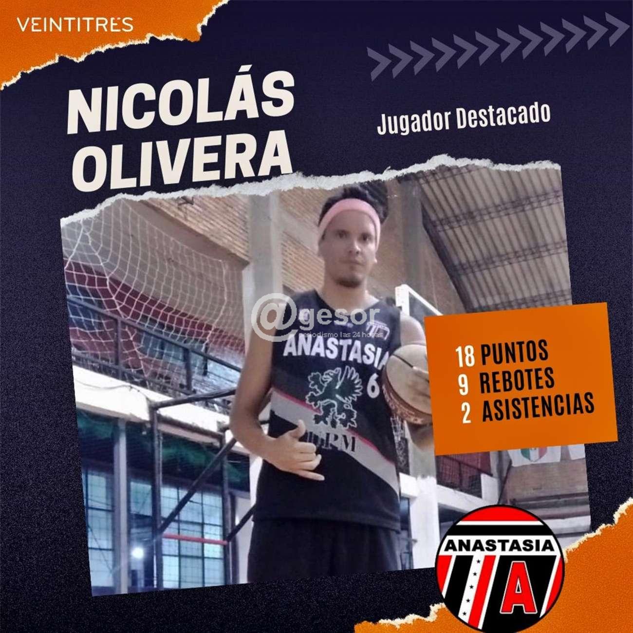 Una destacada victoria consiguió Anastasia de Fray Bentos ante Bella Vista de Dolores jugando como visitante y con varias bajas por razones sanitarias vinculadas con el Covid-19, y en ese triunfo que le permite meterse entre los seis mejores de la Liga Regional de Básquetbol de Soriano, VEINTITRÉS destaca el aporte al equipo, de su representado NICOLAS OLIVERA con 18 puntos, 9 rebotes y 2 asistencias.