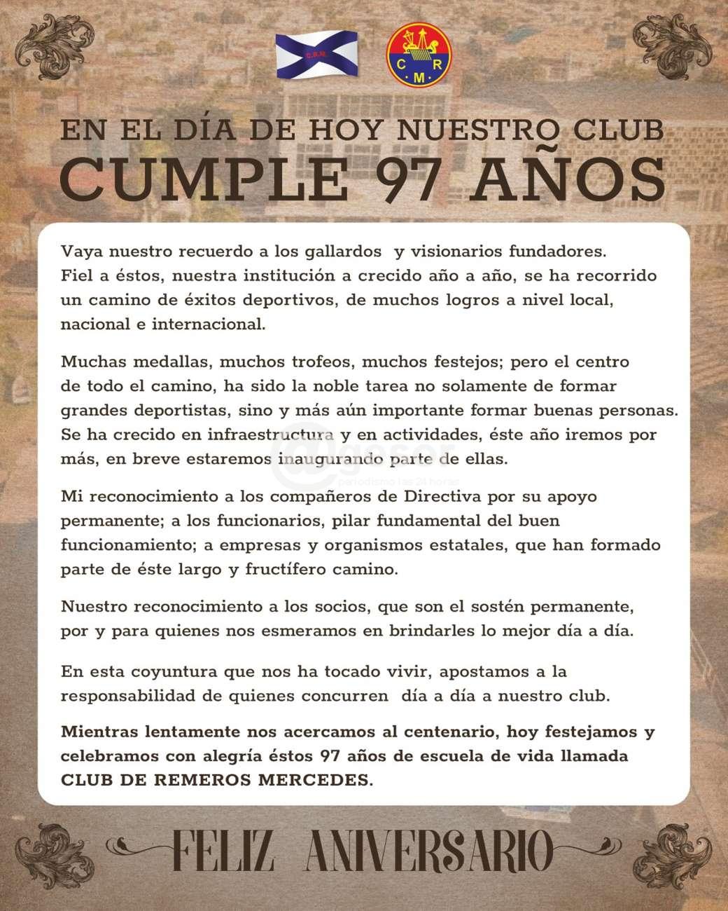 Mientras lentamente nos acercamos al centenario, hoy festejamos y celebramos con alegría estos 97 años de escuela de vida llamada CLUB DE REMEROS MERCEDES.