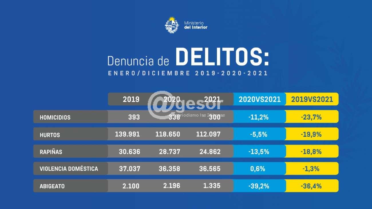 Con datos del Observatorio Nacional sobre Violencia y Criminalidad, el Ministerio del Interior brinda los datos de homicidios, rapiñas, hurtos, denuncias de violencia doméstica y abigeatos entre el 1° de enero y el 31 de diciembre del año pasado.