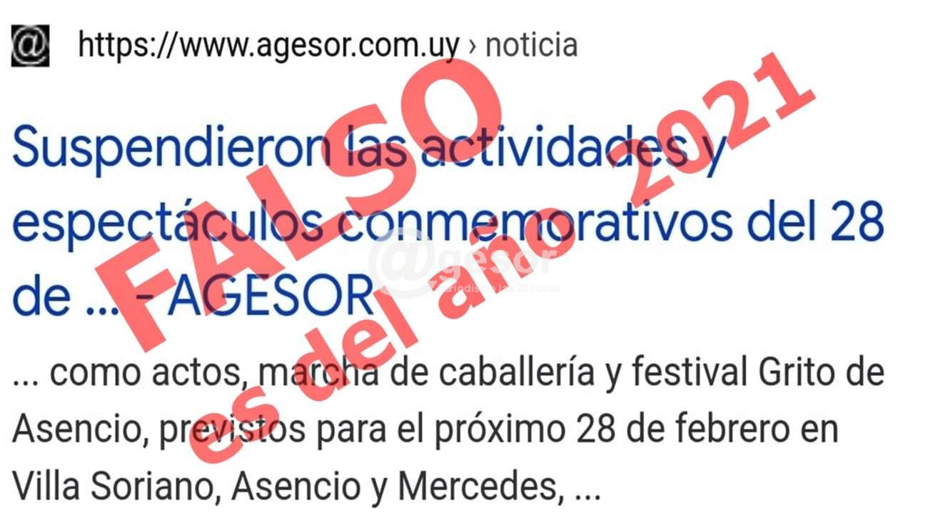 Ante el hecho que hay personas que recortaron digitalmente noticia del año anterior respecto a la suspensión de las actividades y espectáculos conmemorativos del 28 de febrero y atribuyen dicha información a @gesor, ante la consulta de varias personas, nos vemos en la necesidad de aclarar que eo que se está difundiendo es el recorte de una noticia de @gesor publicada el 14 de enero de 2021, no tiene nada que ver con los eventos de este año 2022, ya que consultamos al Intendente Guillermo Besozzi que se encuentra de licencia, aunque en permanente contacto con el Intendente (i) Esc. Daniel Gastán con quien acordó que aquel participara por estar cerca del lugar en el Congreso de jefes comunales realizado este jueves, si había algún cambio respecto de las últimas resoluciones del Comité Departamental de Emergencias y fue tajante: "En Soriano hasta el momento mantenemos todos los eventos y espectáculos que están programados, no hemos suspendido nada y menos aquellos que son al aire libre como dijimos, que es lo que le hemos estado pidiendo a la gente que salga al aire libre y mantenga las medidas de prevención básicas. A su vez este jueves se reunió el Congreso de Intendentes y allí cada Intendencia quedó libre de manejar las situación en conjunto con el Comité de Emergencia y las autoridades de la salud, a nivel departamental encabezadas por el Dr. Rafael Saráchaga, en virtud del momento en que se encuentre el departamento, nosotros entendemos que como han informado los prestadores de salud a pesar del aumento de casos, la situación está controlada, inclusive habrán visto que comenzaron a descender los positivos activos al darse también la recuperación de las personas, por lo tanto hoy, en este momento no hay cambios que nos lleven a tomar ninguna decisión en contrario a lo que resolvimos en el Comité de Emergencias. Ya sea el Carnaval, la Marcha de Caballería, el Festival en Villa Soriano y actos por el Grito de Asencio, así como ahora está desarrollándose el Festival 33 Grados de Muralismo, todo se mantiene. La situación se monitorea en conjunto con las autoridades de la salud, pero en este momento no hay ningún cambio en las medidas".