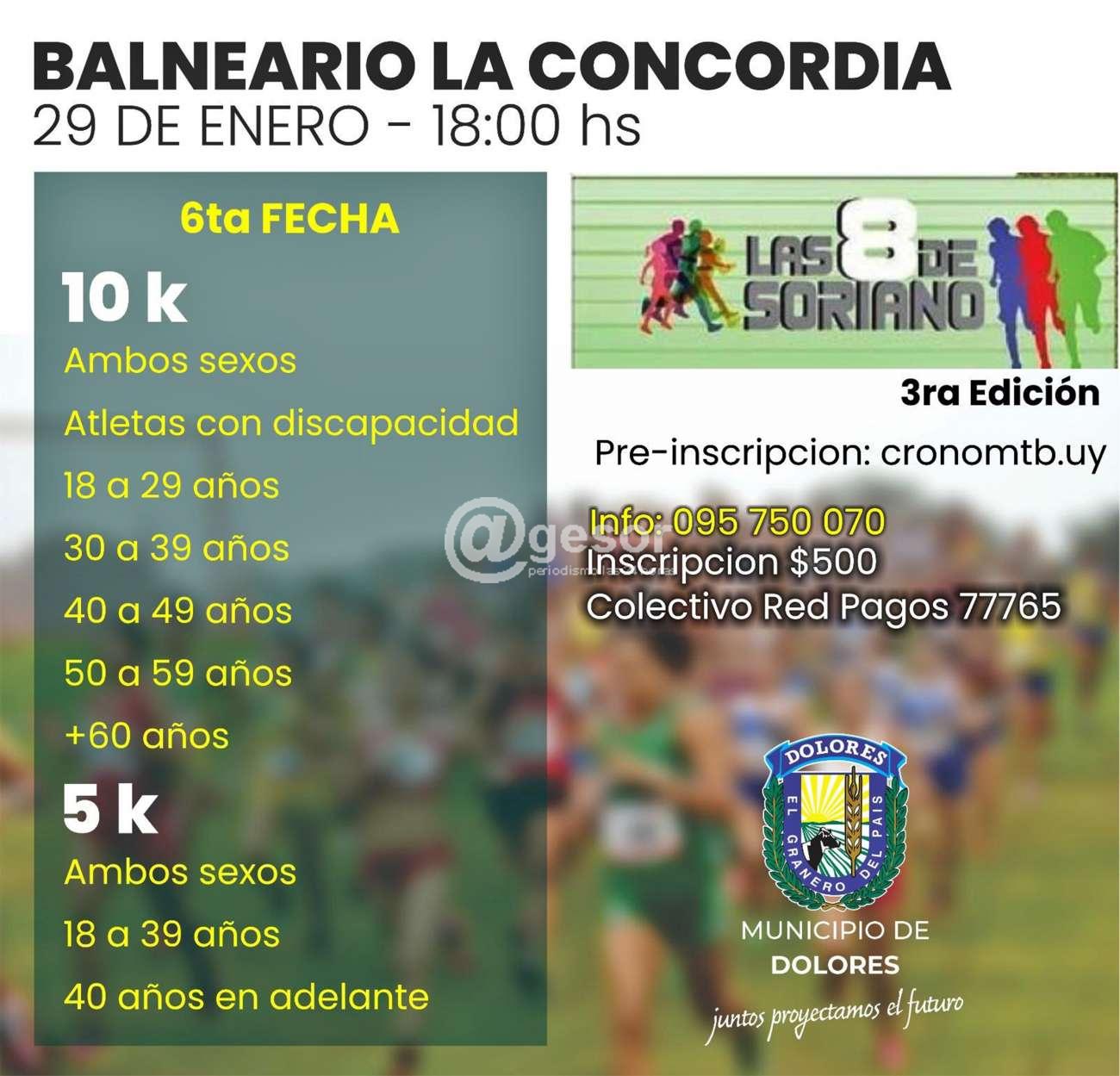 En el marco de la 3ª edición de Las 8 de Soriano, en su 6ª fecha, se lleva a cabo este sábado 29 de enero en el balneario La Concordia con el apoyo del Municipio de Dolores, carreras 10K y 5K.