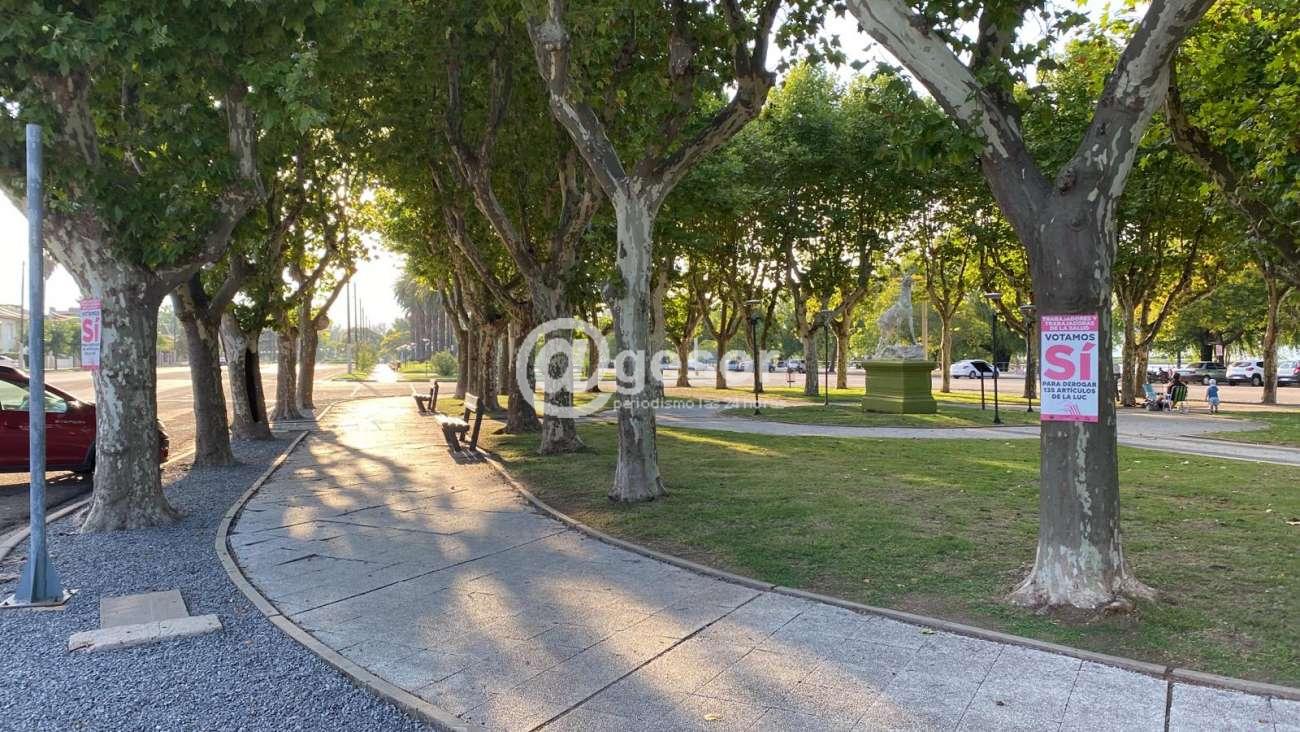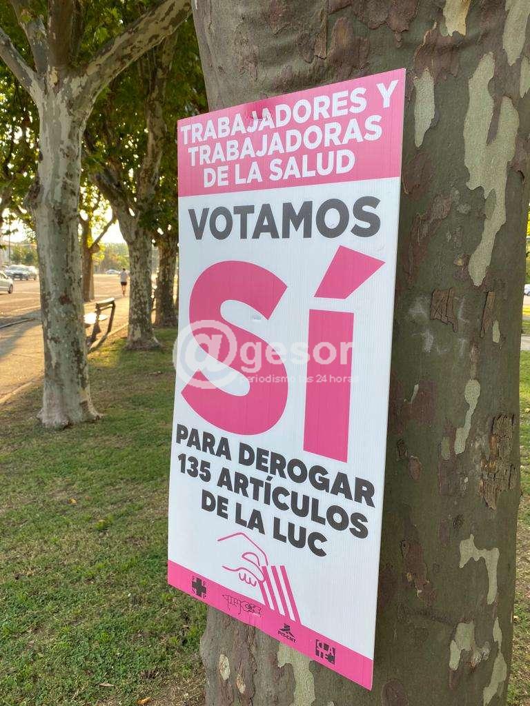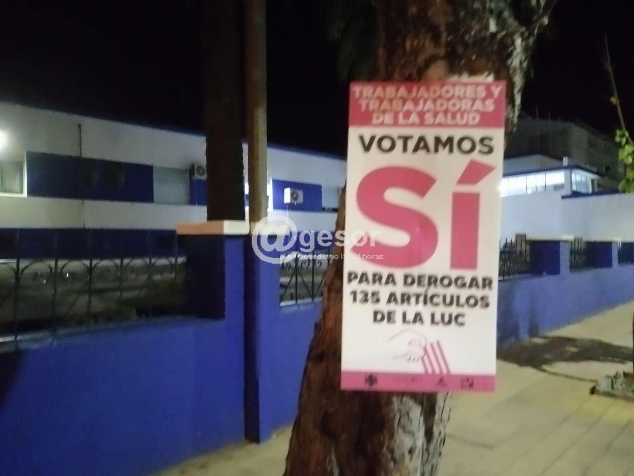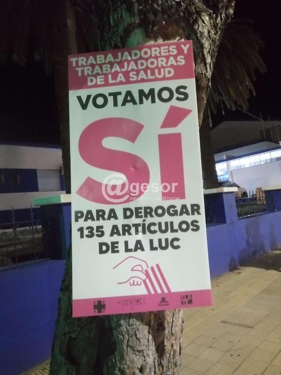 Acordándose  ciertos criterios en la campaña publicitaria en  espacios públicos. El mismo viernes en una rápida recorrida por la ciudad de Mercedes pudo apreciarse, en la rambla  y en otros puntos, cartelería  a  favor del SI a la derogación de  la LUC.  Más  allá del tecnicismo si  la cartelería estaba  puesta antes o después de  dicha reunión, donde se acordaron los criterios, lo  que  nos llamó la atención es la forma que se utilizó para fijar los carteles.  Directamente  con   grapas  en  árboles  y palmeras. Tal  como lo muestra las fotos  tomadas por @gesor  en la vereda del Hospital Mercedes y la rambla.