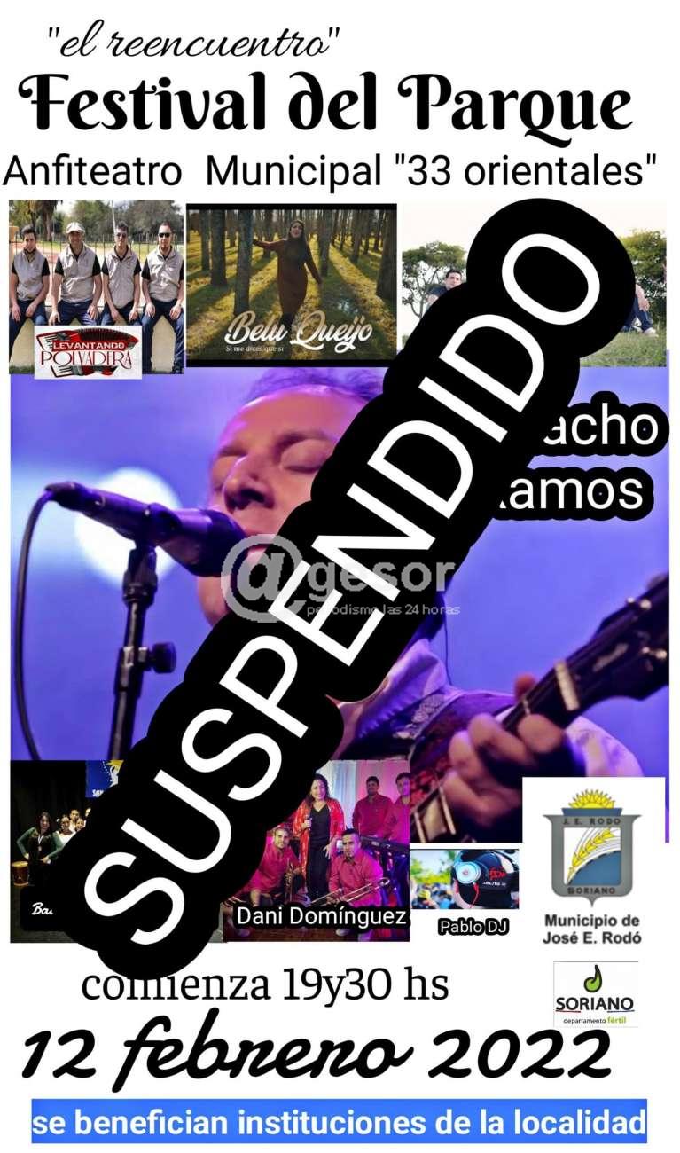 Desde el Municipio de José Enrique Rodó se informó que el Festival del Parque ¨El Reencuentro¨ en el Anfiteatro Municipal ¨33 Orientales¨ de José E. Rodó fue suspendido y será reprogramado. Ante la situación de inestabilidad del tiempo, y pronósticos que no aseguran poderlo llevar a cabo, la nueva fecha será fijada en virtud de la agenda de los conjuntos y artistas que estarían presentes.