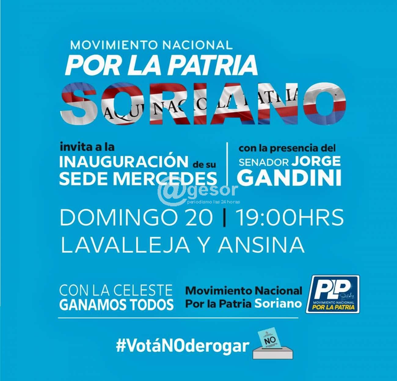 Este domingo 20 a las 19.00 horas el Movimiento Por la Patria de Soriano, estará inaugurando su sede en Mercedes, ubicada en avda. Lavalleja y Ansina, contándose con la presencia del Senador Jorge Gandini.