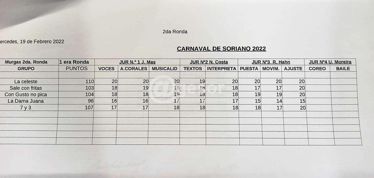 Ofrecemos el detalle de los puntajes dados por cada uno de los cinco jurados en la segunda ronda a cada grupo