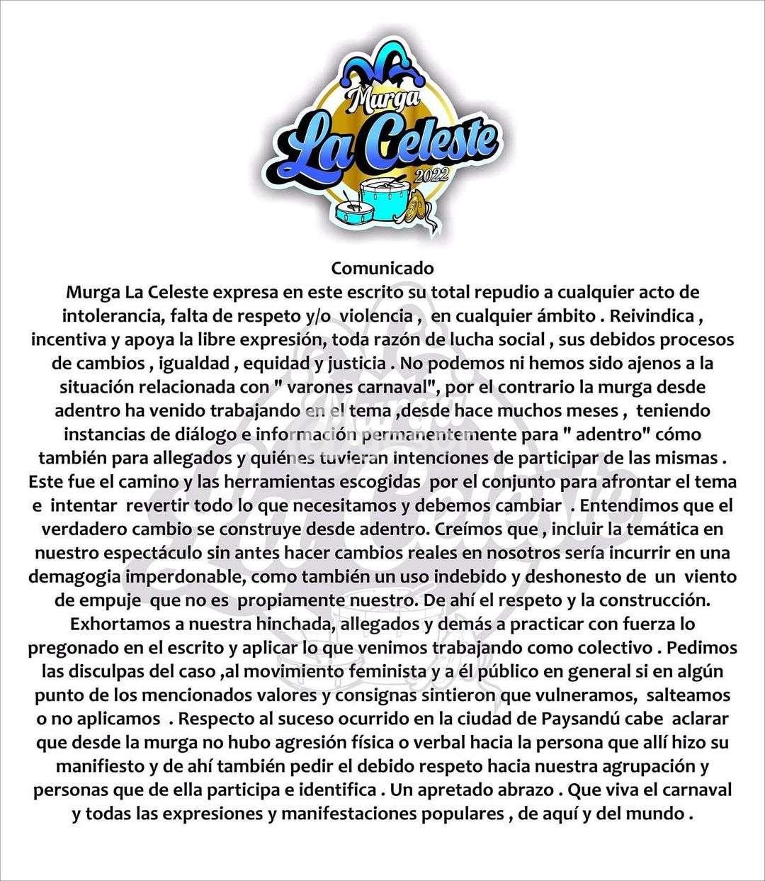 Murga La Celeste expresa en este escrito su total repudio a cualquier acto de intolerancia, falta de respeto y/o violencia, en cualquier ámbito. Reivindica, incentiva y apoya la libre expresión, toda razón de lucha social, sus debidos procesos de cambios, igualdad, equidad y justicia. No podemos ni hemos sido ajenos a la situación relacionada con “varones carnaval”, por el contrario la murga desde adentro ha venido trabajando en el tema, desde hace muchos meses, teniendo instancias de diálogo e información permanentemente para “adentro” cómo también para allegados y quienes tuvieran intenciones de participar de las mismas .