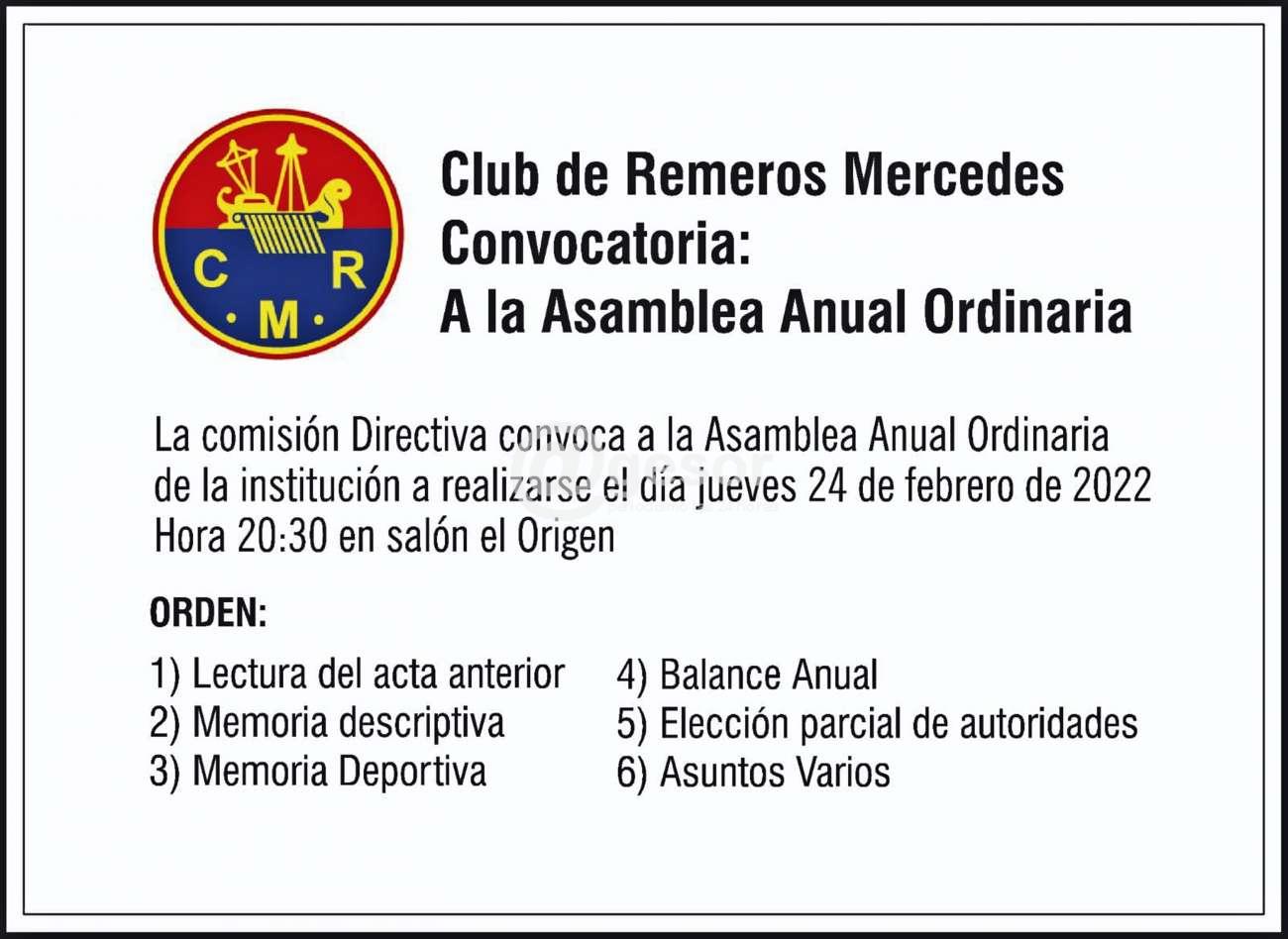 Este jueves 24 a la hora 20.30, en el salón "El Origen" se lleva a cabo Asamblea Anual Ordinaria del Club Remeros Mercedes, con orden del día que establece: