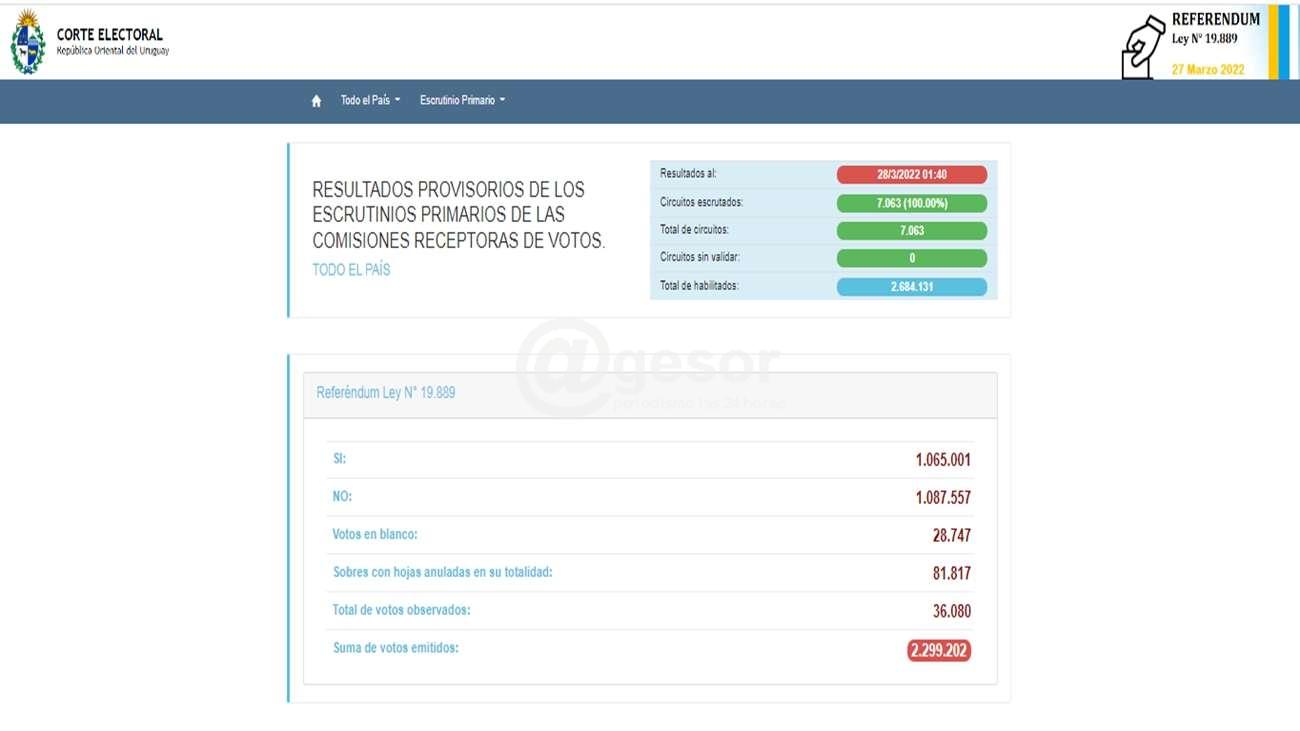 El mapa de Uruguay se pintó de celeste (color de la papeleta predominante) ya que en 16 de los 19 departamentos, culminado el escrutinio primario, triunfó la opción del NO a la derogación de los 135 artículos de la Ley de Urgente Consideración (LUC), solamente en Montevideo, Canelones y Paysandú, obtuvo la victoria el SI con la papeleta rosada.