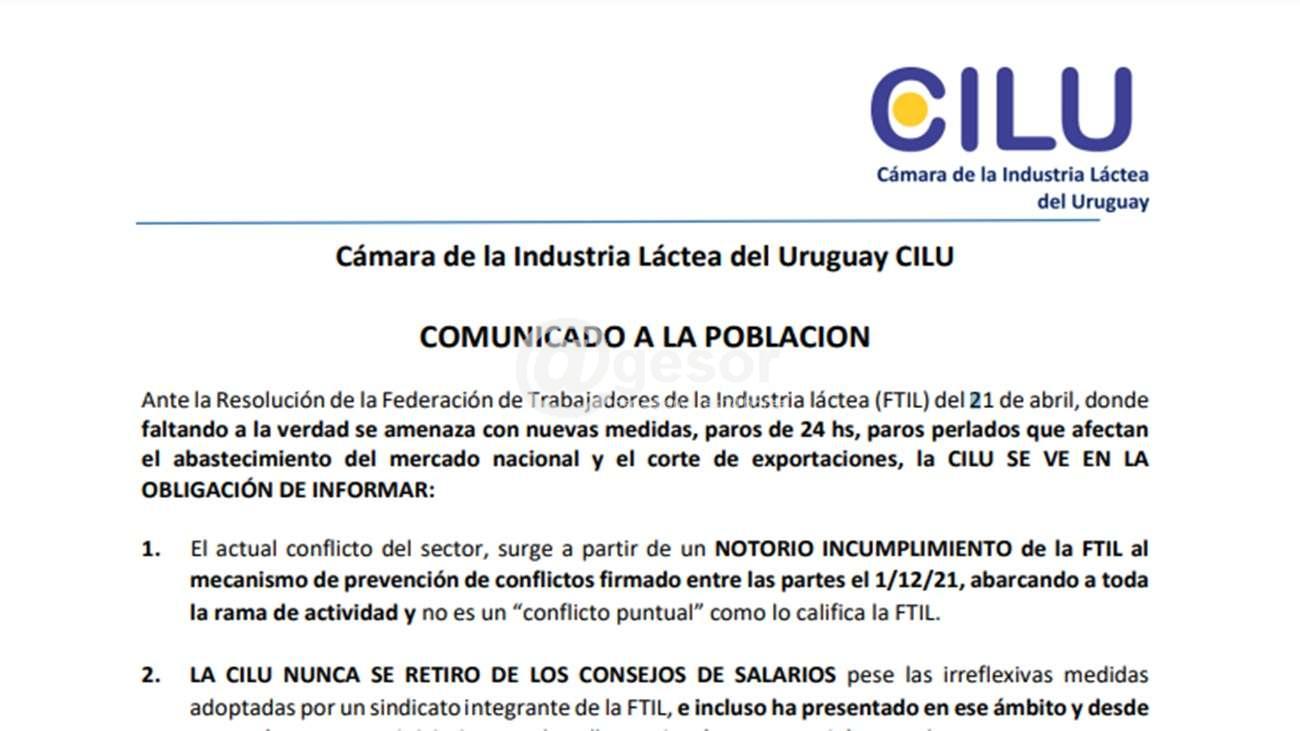 Comunicado de la Cámara de la Industria Láctea de Uruguay (CILU) en respuesta a la declaración de conflicto de la FTIL
