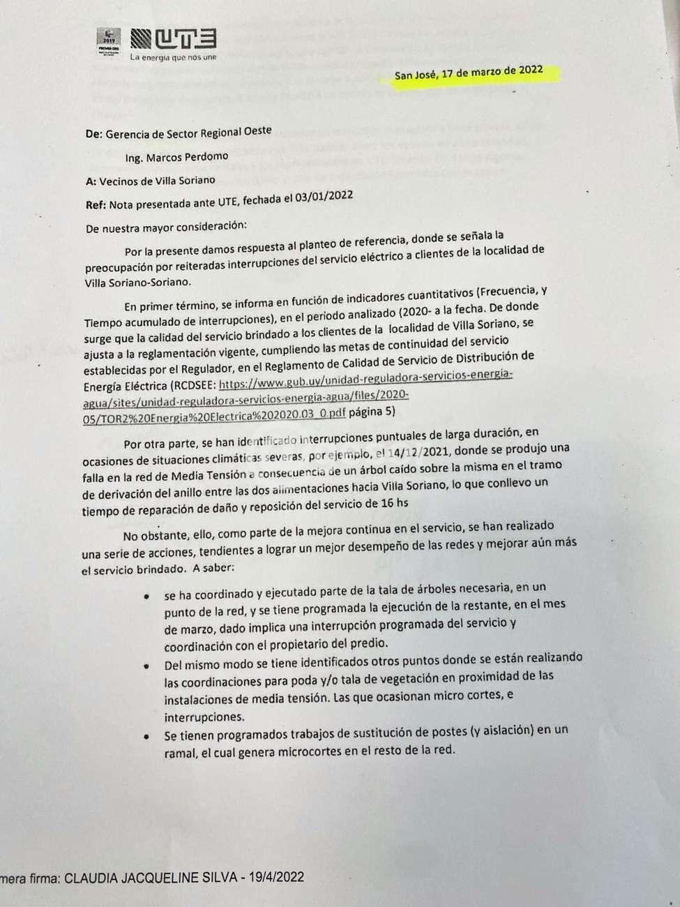 Adjuntamos copia de la nota enviada por UTE a Vecinos de Villa Soriano