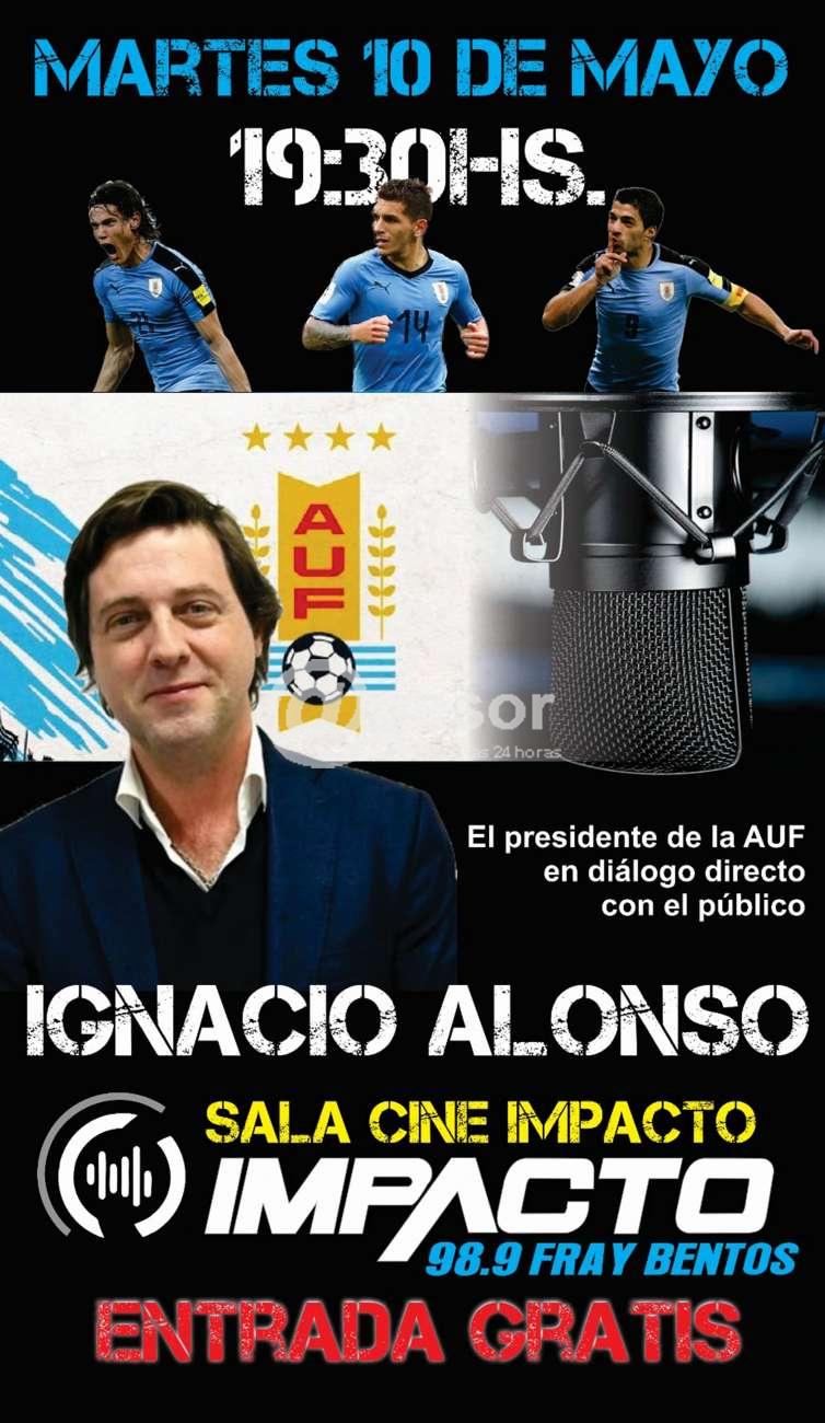 Este martes 10 el Presidente de la AUF, Ignacio Alonso, en diálogo directo con el público, en sala de Cine Impacto de Fray Bentos, una oportunidad de conocer como piensa y consultar a quien está al frente del fútbol profesional uruguayo y de esa manera profundizar en el presente y futuro de éste, teniendo en el horizonte una nueva participación de Uruguay en un Mundial como el de Qatar 2022.