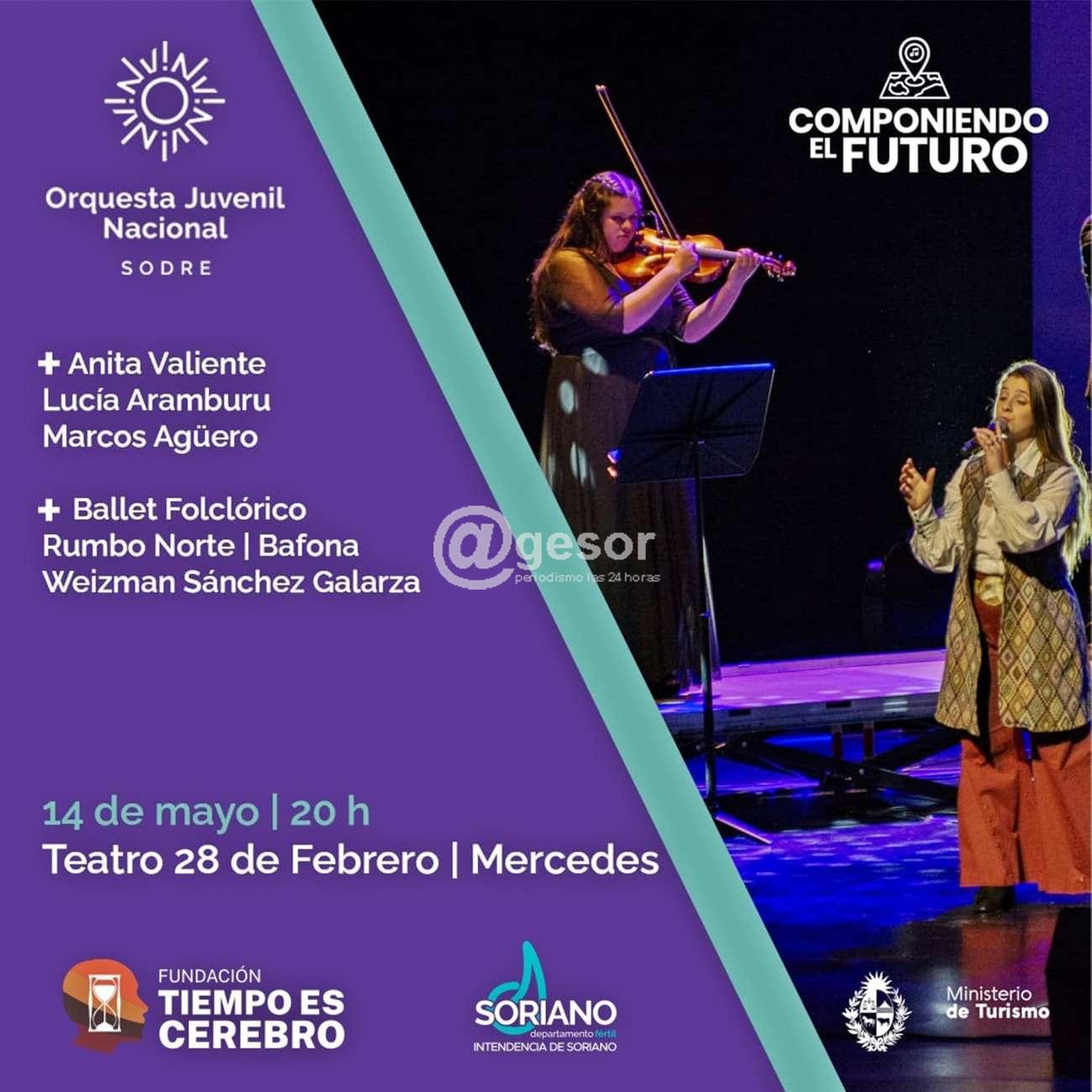 Este sábado 14 de mayo desde las 20.00 horas en el Teatro "28 de Febrero" con la organización de la Fundación "Tiempo es Cerebro" estará realizándose espectáculo musical denominado "Componiendo el futuro" con la presencia de la Orquesta Juvenil Nacional Sodre, más la actuación de Anita Valiente, Lucía Aramburu, Marcos Agüero; a ello se suma el Ballet Folclórico Rumbo Norte / Bafona, Weizman Sánchez Galarza.