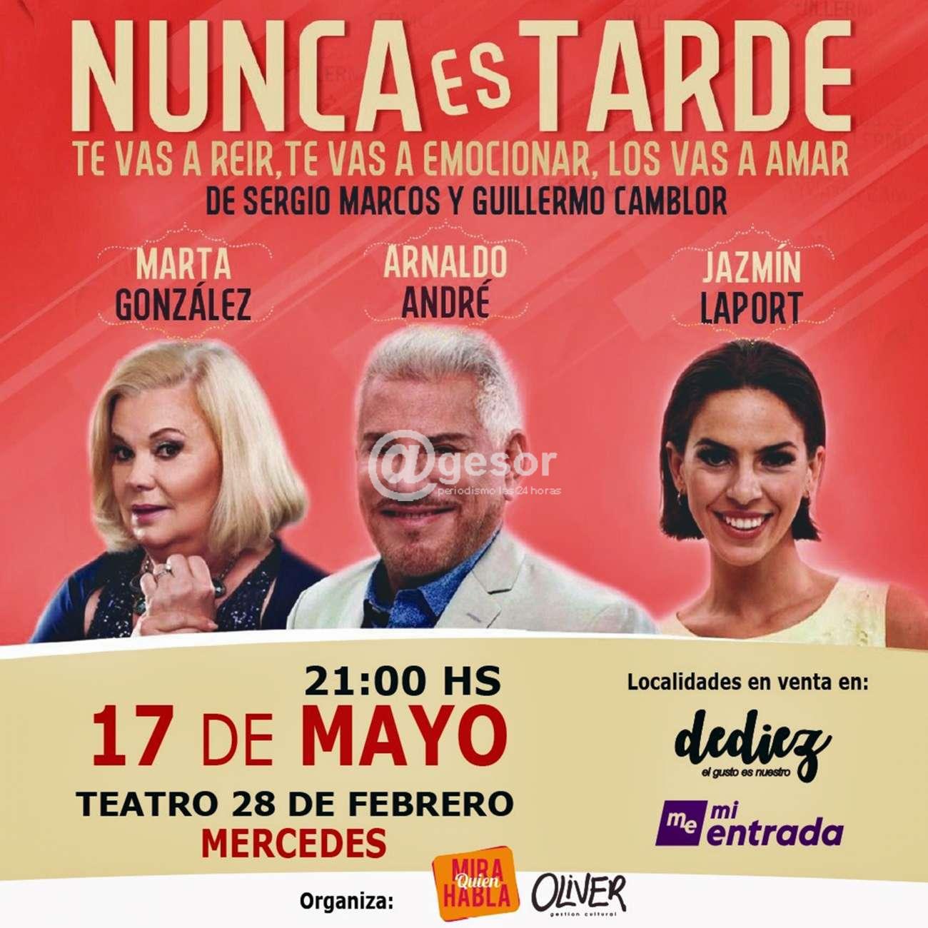 Este martes 17 de mayo a las 21.00 horas el Teatro 28 de Febrero de Mercedes (Soriano), será escenario de la presentación de la obra "Nunca es tarde" de Sergio Marcos y Guillermo Camblor, con la actuación de Arnaldo André, Marta González y Jazmín Laport.